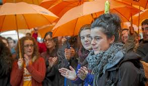Jone Amezaga surrounded by supporters with orange (LIBRE’s colour) umbrellas prior to police raid in Gernika