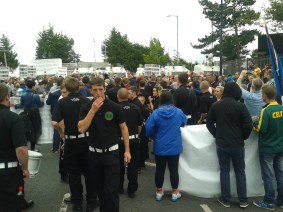At the junction with Old Park Road I joined with the Dublin Committee comrades, apologising for my late arrival as we swung right to head towards the city centre. Further down the road, the police vans awaited us and as we got nearer we could see a blockade composed of police vans backed up by many police in full riot armour, holding shields and with batons drawn. We marched on and in minutes we were crowded against them. I feared for us if we tried to get through and I saw a drummer with one of the bands step out and retire to the sides with his drum. I didn’t blame him – drums are expensive pieces of equipment. The police had a big sign on one of their vans, saying that our march was illegal, a message they were reiterating from their p.a system, though difficult to decipher all the words.