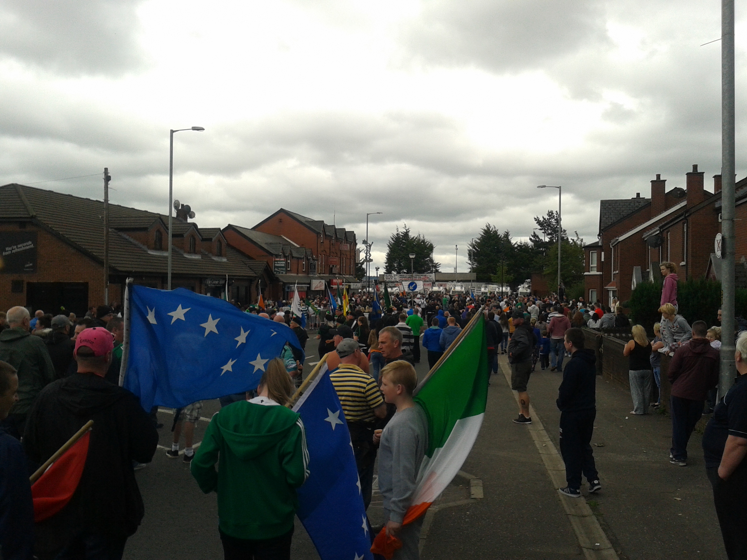 The driver dropped us near to my destination, apologising again as he had done frequently. We assured him it was not his fault. As I walked down to approach the rallying point for the march, some of the local community were out in the street playing at an poc fada (“the long hit”), a one-shot competition with hurley to see who can hit the sliotar (the leather ball used in hurley games) the furthest. An poc fada is one of the features of the Féile Béal Feirste, an annual community festival which has been growing annually (and which some say has now largely become a commercial festival, far from its community roots, with dear admittance fees and drink prices, in an area with very high unemployment).