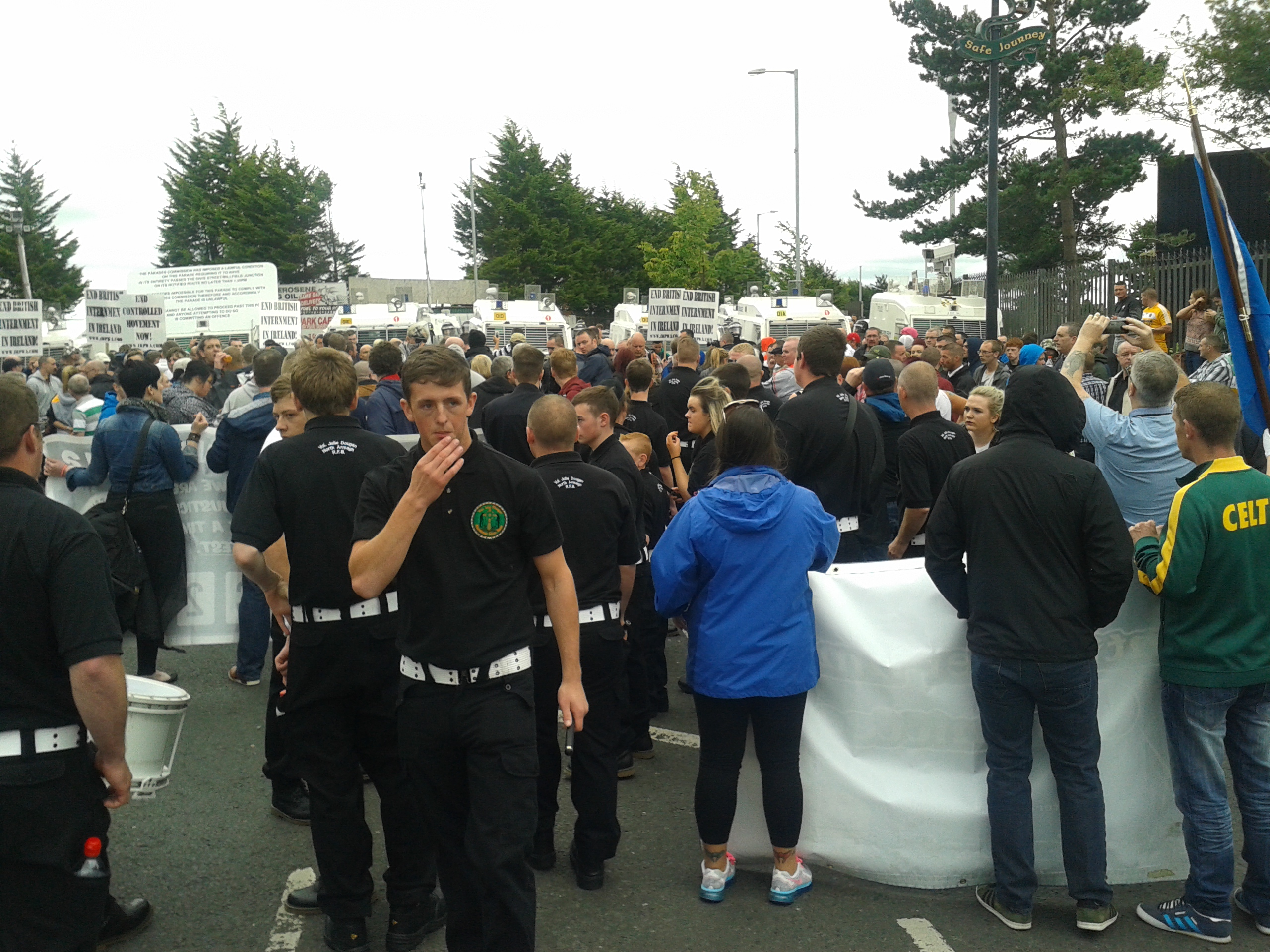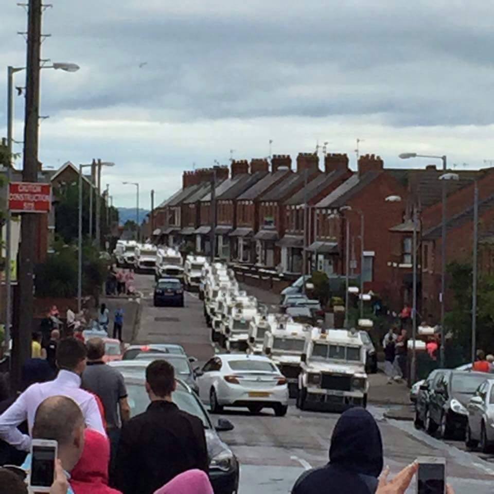 We had not gone far after dropping off one of the youths before we began to pass the PSNI vans, a kind of white boxed landrover, shields over windscreen, lights and siren and only slit windows in the back. From the taxi by now we had seen around 30 vans; we were all tutting at this massive police mobilisation. “Great day for a robbery,” I said. “Where’s the nearest bank?” quipped the elderly man. As we got nearer to Ardoyne we were suddenly confronted with a huge number of police vans and very soon afterwards, could go no further – PSNI vans, police on foot in black riot gear, shields and some with batons out already. Any belief I might have had that this was just an intimidation exercise by the police was dispelled. Our driver tried to negotiate with a female police officer who was dealing with traffic but all she could give were vague suggestions about which roads might yet be open. I heard our driver relaying information to his company’s control desk through his radio and I now realised that the police were determined to stop the march.