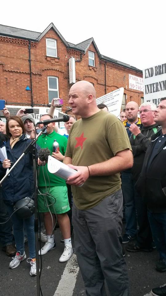 After a while in literal impasse, one of the organisers spoke briefly into the p.a system and introduced Mícheál Mac Giolla Easpuig, an Independent local authority representative in Donegal. Mac Giolla Easpuig spoke first for awhile in his native Irish and then changed to English. He summarised the history of English colonial repression in Ireland since 1970 and