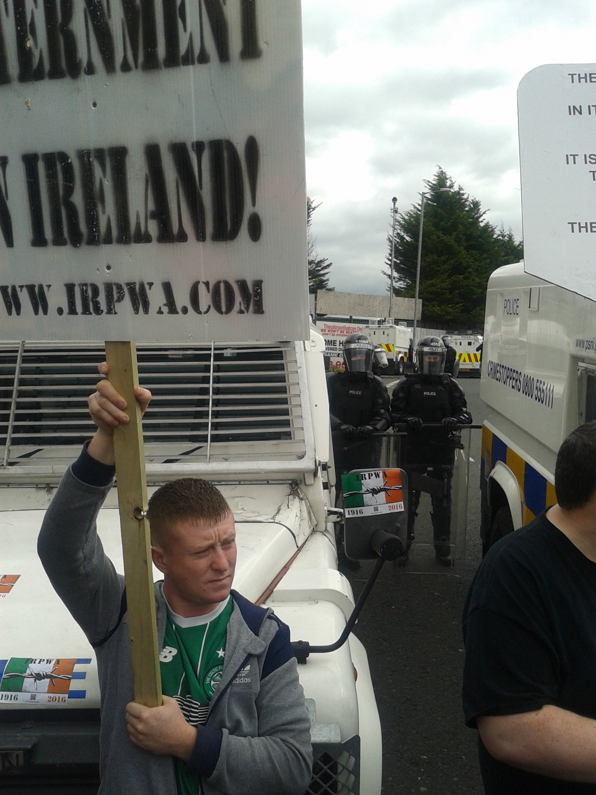 At the junction with Old Park Road I joined with the Dublin Committee comrades, apologising for my late arrival as we swung right to head towards the city centre. Further down the road, the police vans awaited us and as we got nearer we could see a blockade composed of police vans backed up by many police in full riot armour, holding shields and with batons drawn. We marched on and in minutes we were crowded against them. I feared for us if we tried to get through and I saw a drummer with one of the bands step out and retire to the sides with his drum. I didn’t blame him – drums are expensive pieces of equipment. The police had a big sign on one of their vans, saying that our march was illegal, a message they were reiterating from their p.a system, though difficult to decipher all the words.