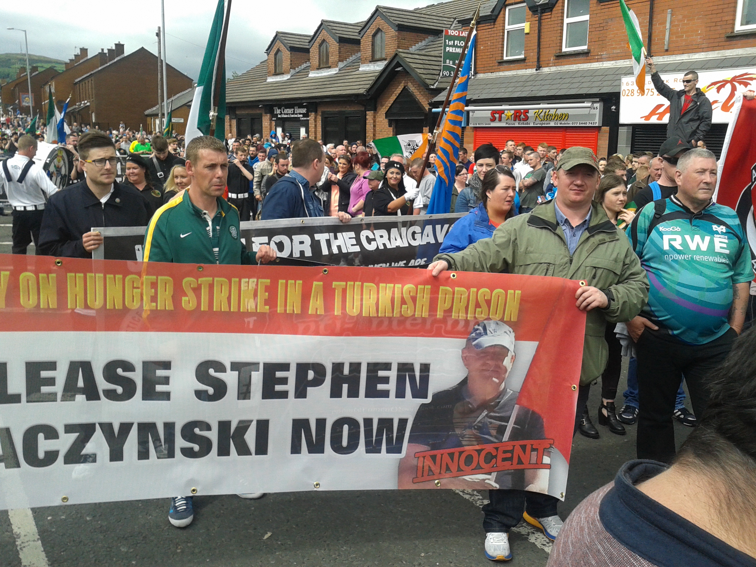 One of the Republican marching bands played the verse and chorus of the Irish national anthem, The Soldiers’ Song; I sang along to it in Irish as is our custom in Dublin (but seems not to be in Belfast) and the band began to march away from the police blockade. We marched away behind them with the banners of the Dublin Committee, as did others with different campaign banners: Craigavon Two, Ballymurphy Massacre, Stephen Kaczinsky, Gavin Coyle and various Republican prisoner support groups.