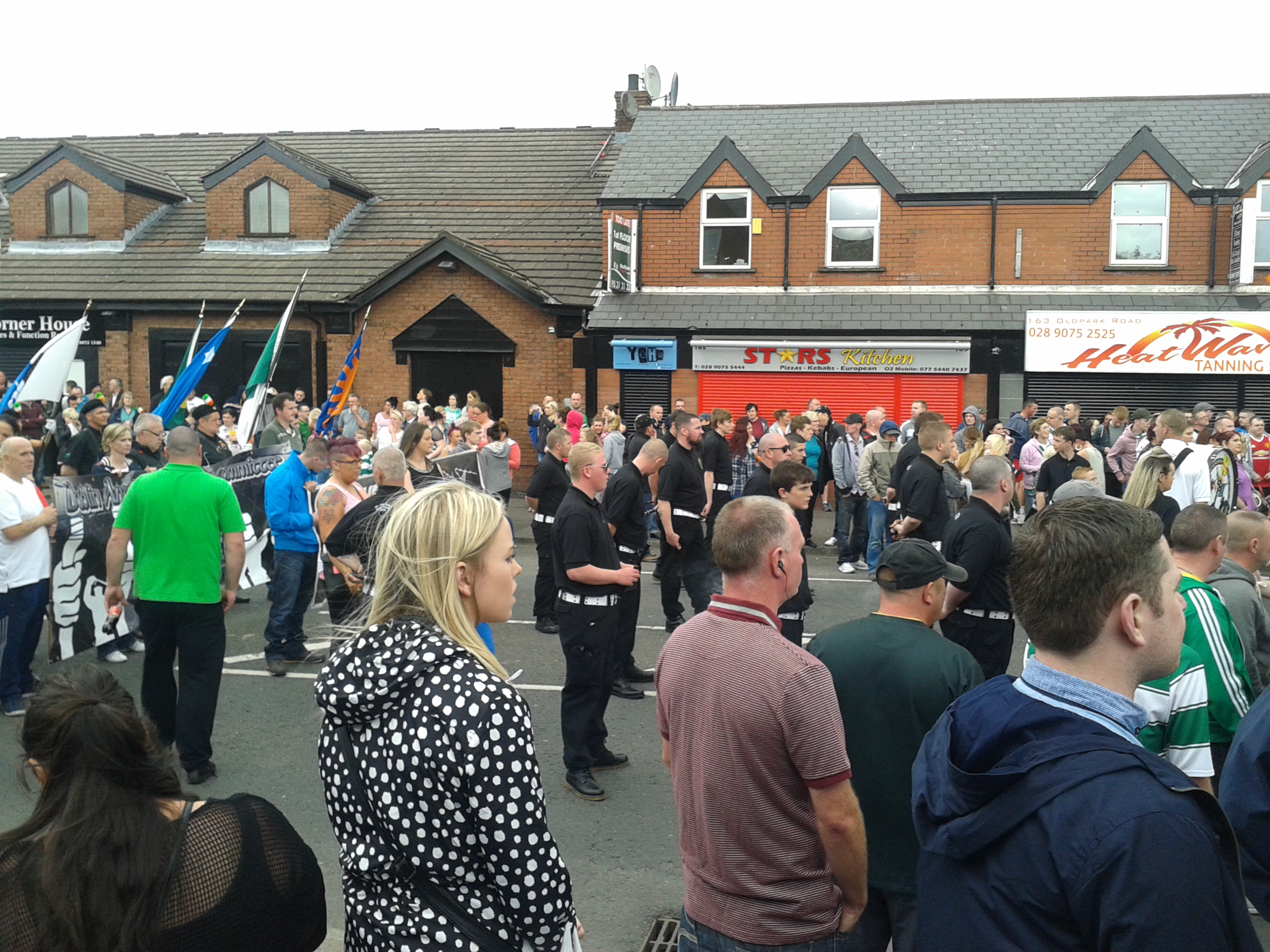 It certainly seemed like that when I walked in to the depot of the shared “people’s taxis”, i.e. the Falls Road Black Taxis about 1.45p.m. The word was that the RUC/ PSNI had cordoned off the southern approaches to Ardoyne, in North Belfast. I began to worry but was told that they would get me there. With a small group of Ardoyne residents, I waited in the depot, which resembles a coach waiting room and has a shop for sweets and soft drinks and another printing T-shirts and posters. Taxis pulled in and out, mostly heading for the Falls Road but eventually a taxi for Ardoyne (Ard Eoin = “Eoin’s Heights”) drew up and six of us got in – apart from myself, two youths, a middle-aged woman and an elderly couple, one of them with an English accent but clearly established in the area.