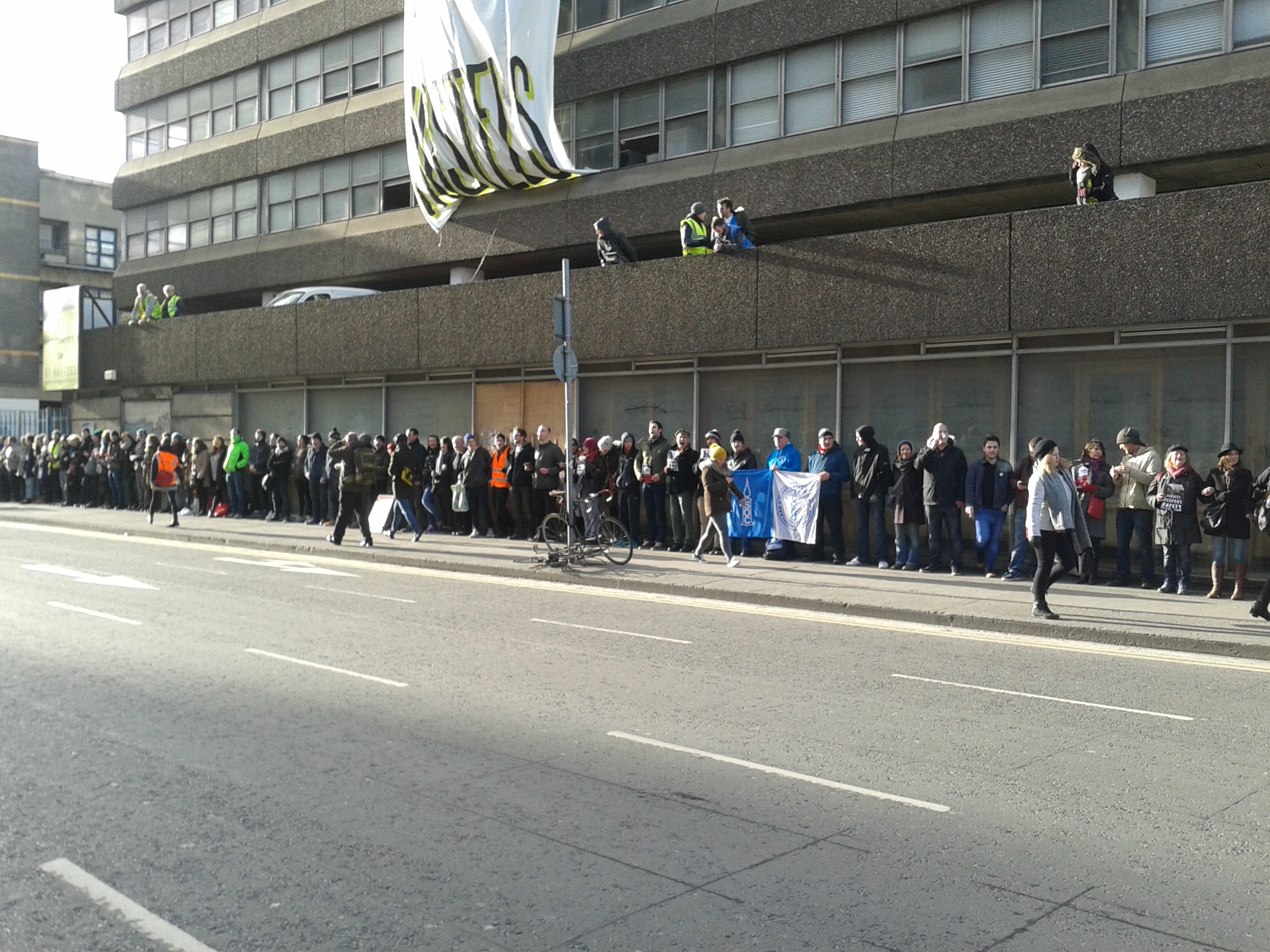 People were asked to link arms symbolically around the building, which many did and the line extended from Townsend Street/ Tara St. and the full length of Poolbeg Street.
