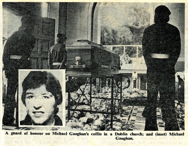 On the 8th of June 1974, the body of IRA Volunteer Michael Gaughan arrived in Dublin, where it was met by mourners and an IRA guard of honour. The body was brought to the Adam and Eve’s Franciscan church on Merchant’s Quay, where thousands filed past as it lay in state (no doubt under the watchful eyes of the Garda Special Branch).