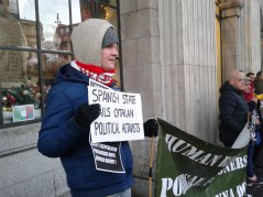 Despite the seriousness of the issue and the bitter cold, the mood was upbeat, assisted by a music player broadcasting a range of songs, from Sifre’s “Something Inside So Strong”, through Warshaw’s “The Cry of the Morning” (sung by Christy Moore) to “Els Segadors”. Some protesters sang along to the songs and passers-by could be heard joining in too.