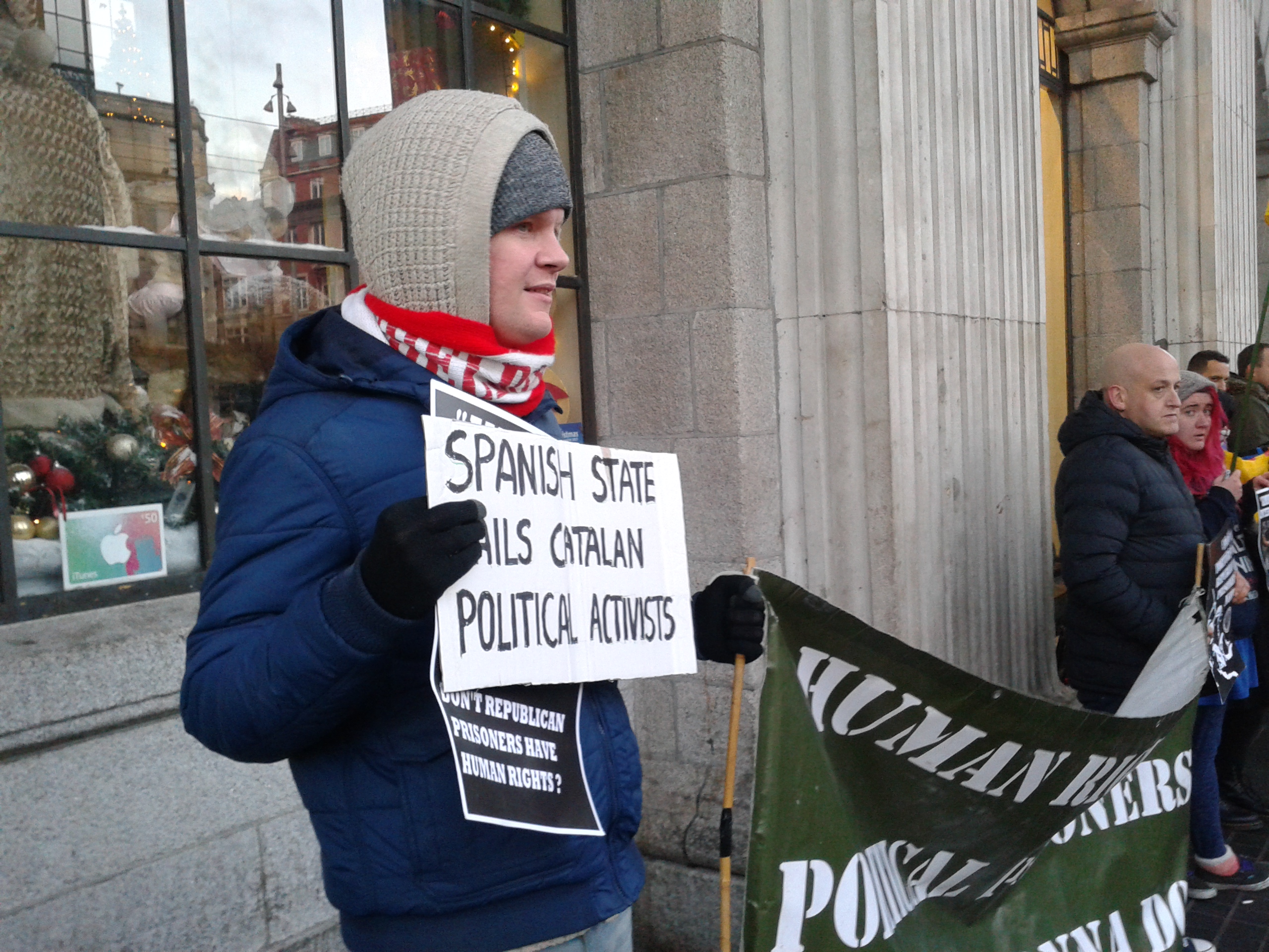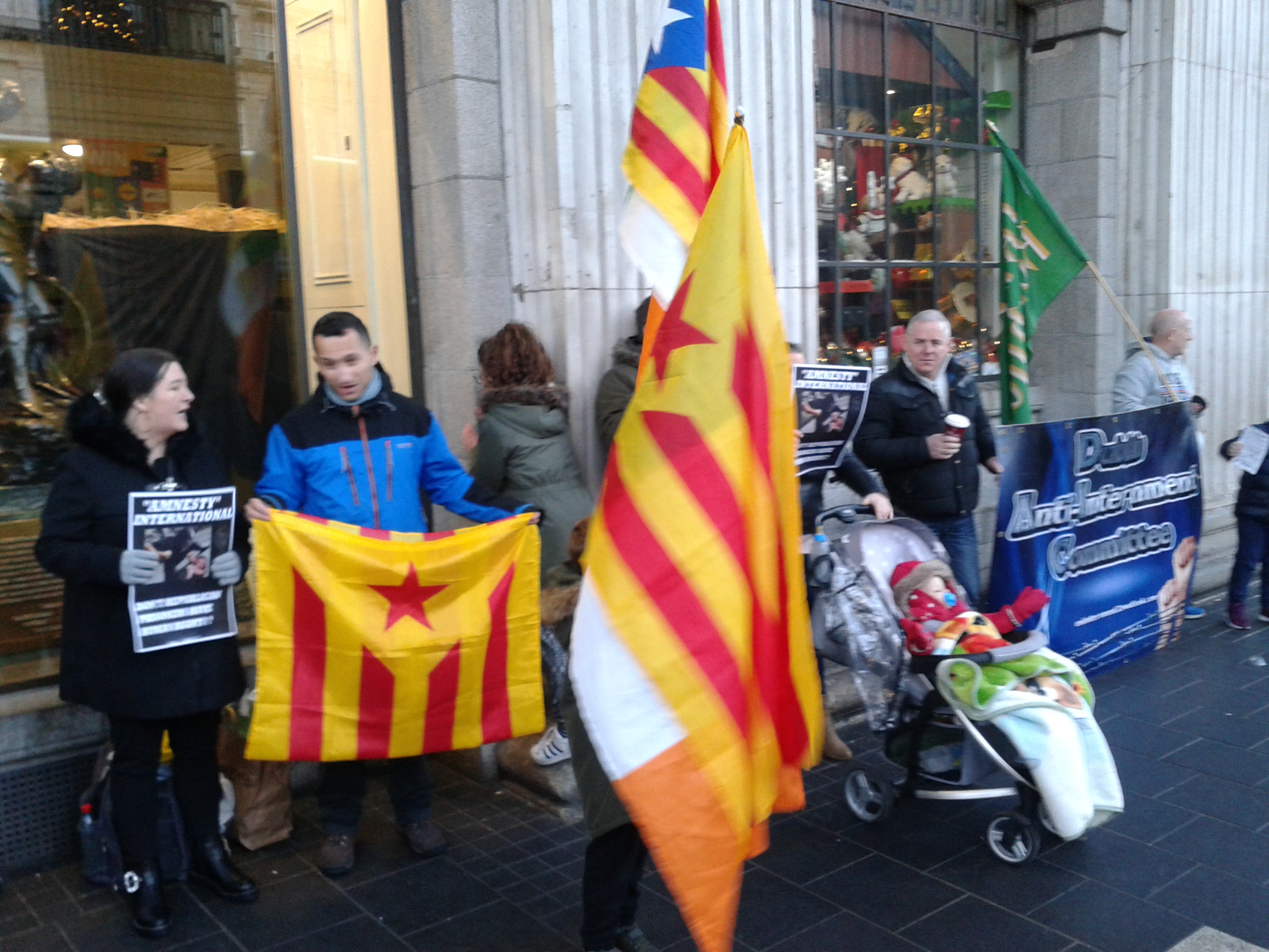 A spokesperson for the Committee briefly addressed the attendance at the end of the event, thanking them for attending to support Irish and Catalan political activists being jailed without trial. Referring to the few passers-by who shouted “Viva Espaňa!”, the spokesperson said that there is nothing wrong with pride in one’s country but queried why the sight of a Catalan flag brought that response and why the definition of Spanish nationhood for these people is bound up with the denial of the rights of another nation to determine its own future. The spokesperson declared that every nation has a right to determine its own future and to do so without threats and repression, pointing out that the Spanish State is attempting to jail the whole Catalan Government for carrying out their election promises and has jailed the leaders of two independence organisations without trial.