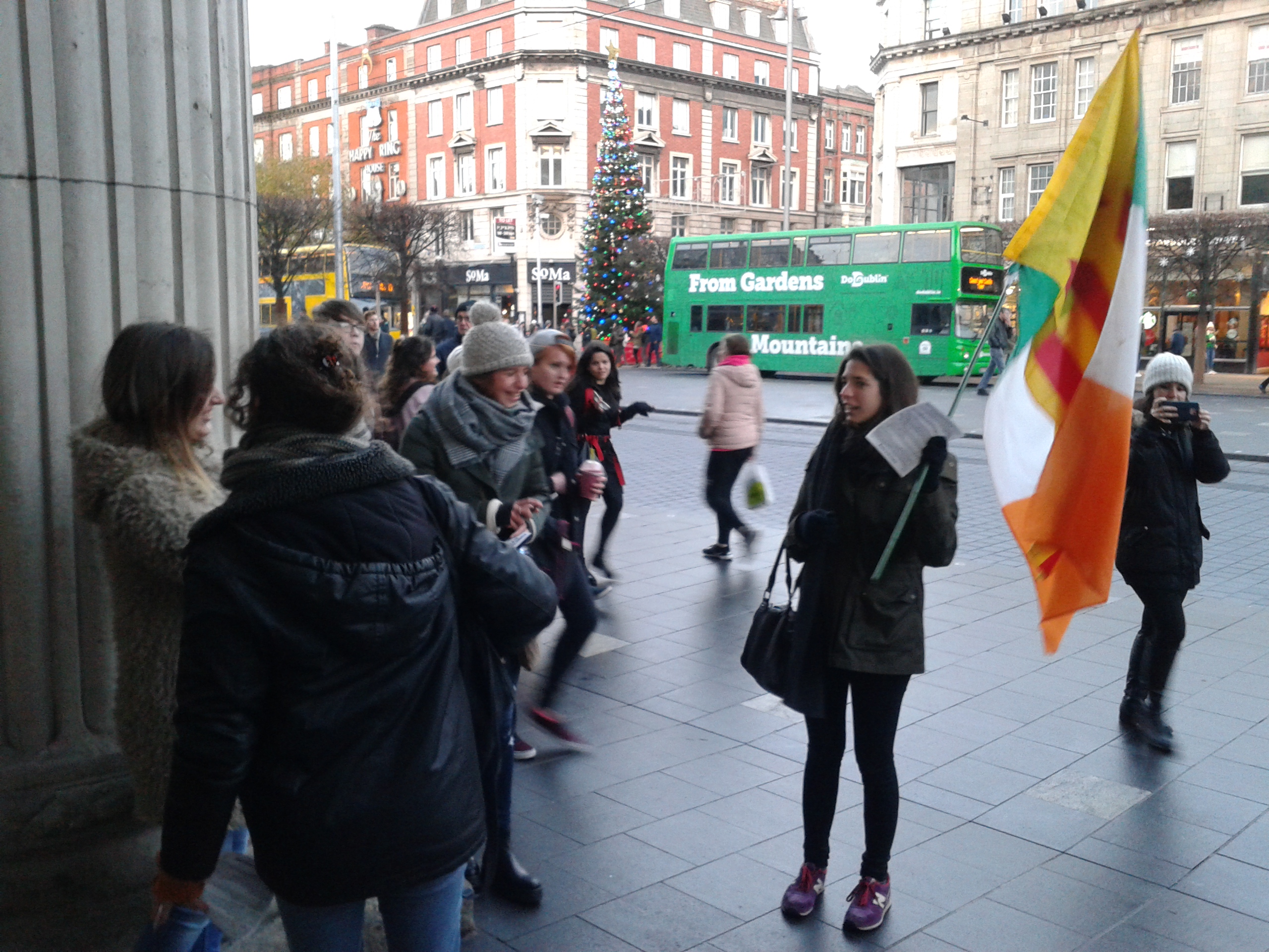 Despite the seriousness of the issue and the bitter cold, the mood was upbeat, assisted by a music player broadcasting a range of songs, from Sifre’s “Something Inside So Strong”, through Warshaw’s “The Cry of the Morning” (sung by Christy Moore) to “Els Segadors”. Some protesters sang along to the songs and passers-by could be heard joining in too.