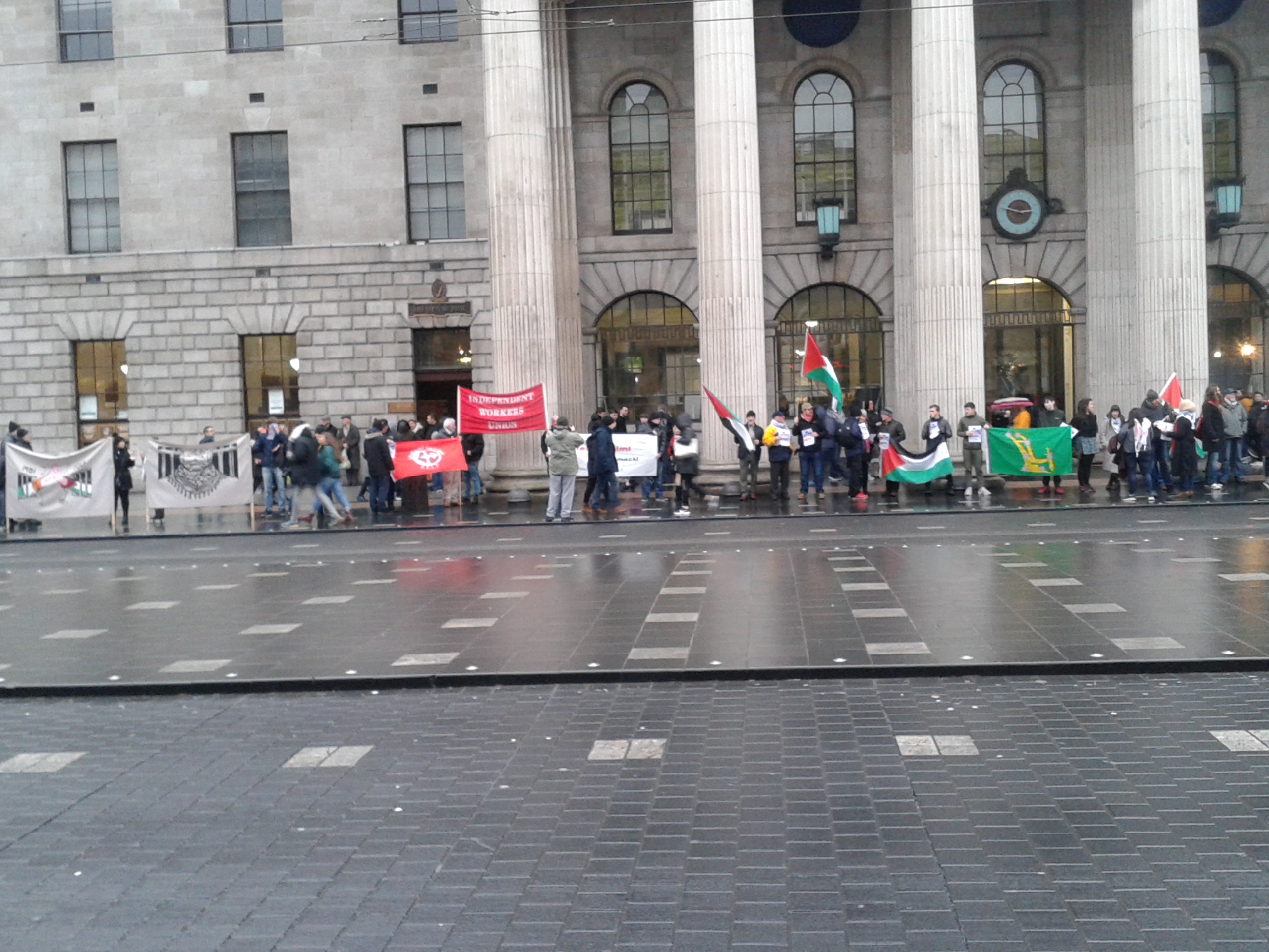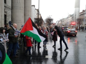 The Dublin picket on Saturday attracted the support of a wide section of the Republican and Socialist Left: the Independent Workers’ Union banner was in evidence as were a number of painted banners previously seen on pickets by the Dublin Anti-Internment Committee, along with independent Irish Republican activists. Fatin al-Tamimi, Chairperson of the Ireland Palestine Solidarity Committee and a number of that organisation’s activists were also present, some distributing IPSC leaflets, as were a number of activists associated with campaigns against the Water Charge, against the demolition of Moore Street and in support of ending homelessness. Fatin al-Tamimi, who although bearing the same family name is not related to Ehed’s family, will not in future be permitted by the Israeli state to visit her relatives (see item on Israel’s public blacklist below).