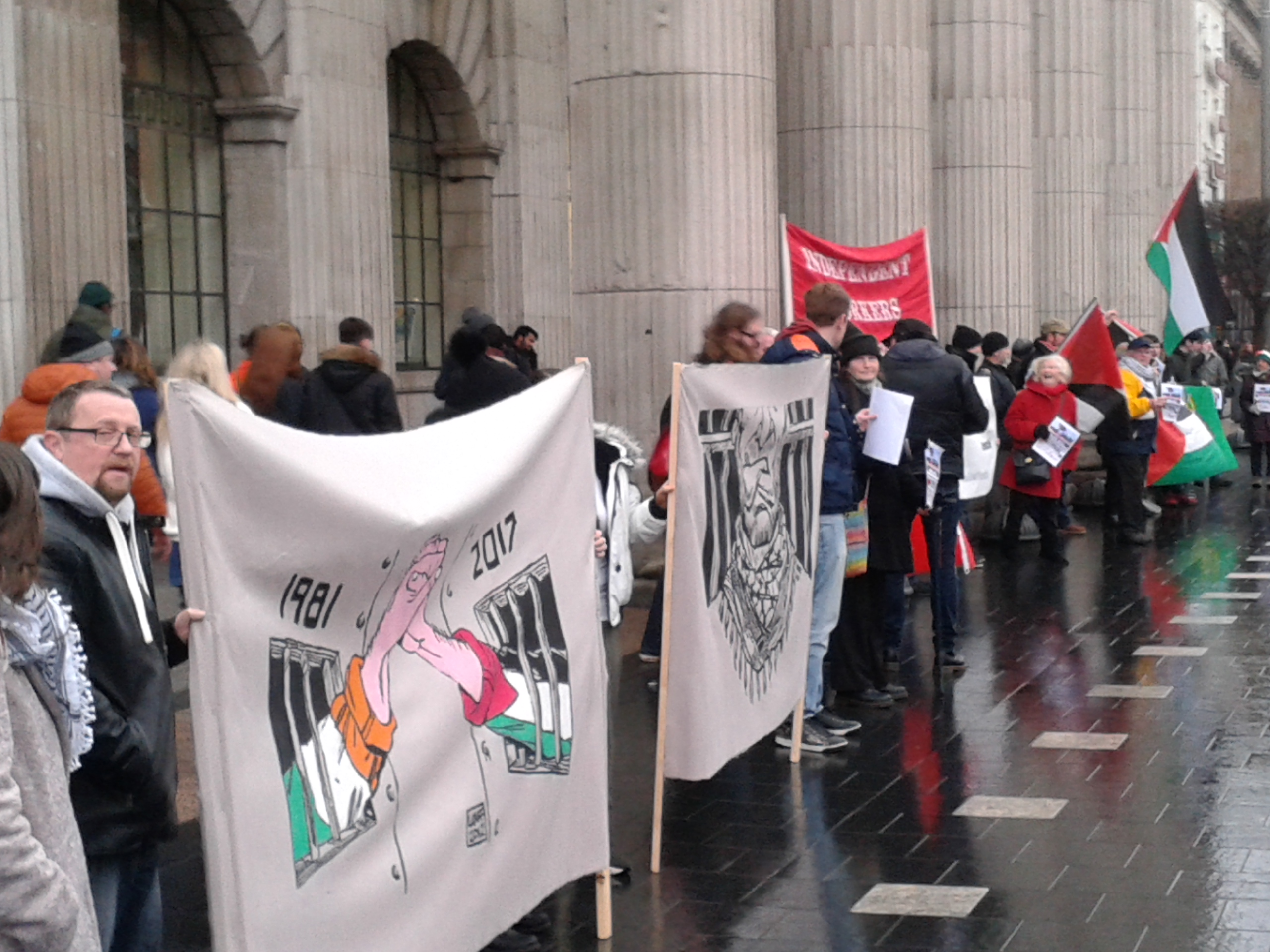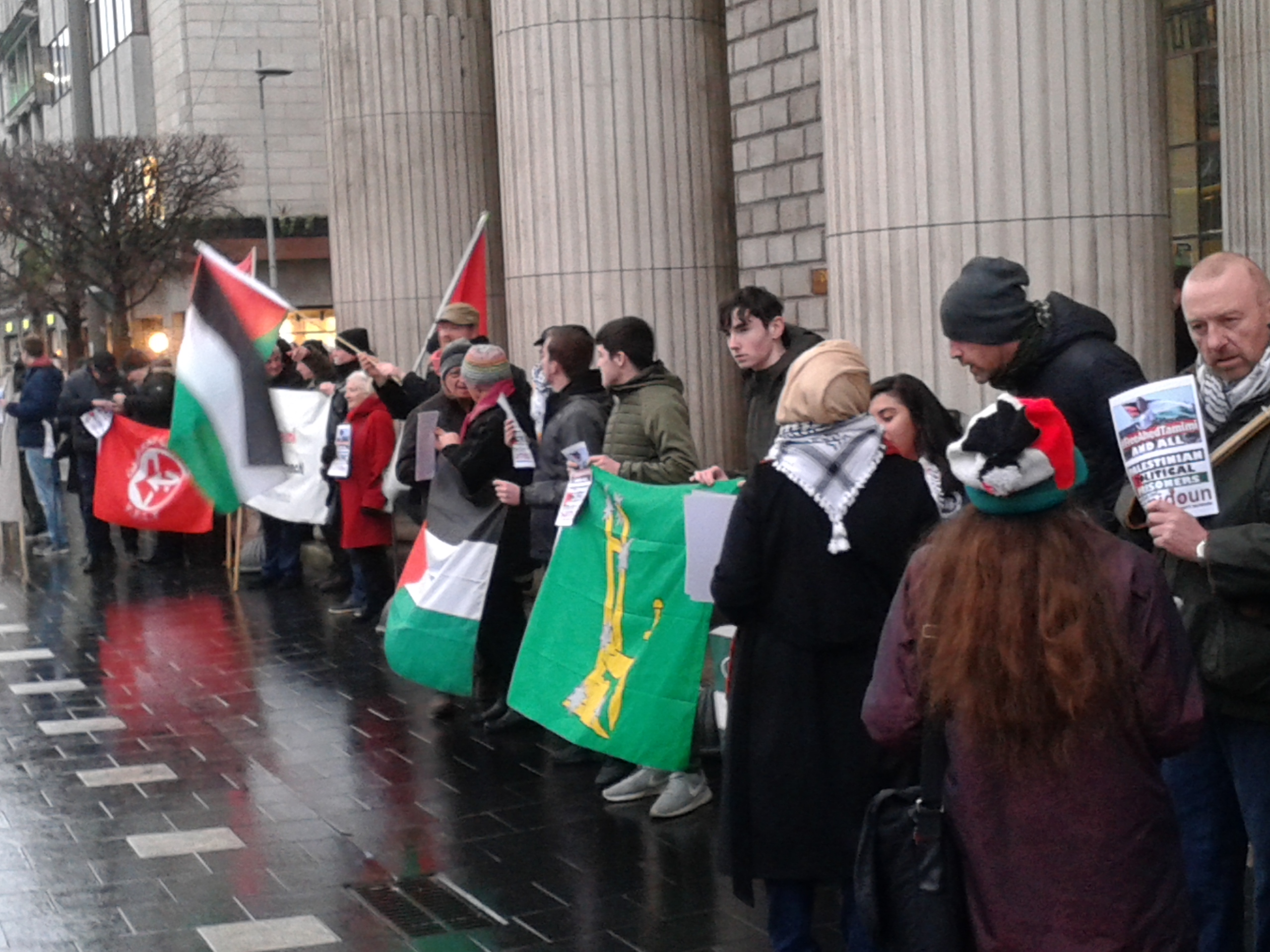 A wet Saturday afternoon saw a large crowd attend a protest picket organised by the Anti-Imperialist Action organisation; it was in specific solidarity with Palestinian Teenager Ehed Tamimi, jailed in December last year by the Israeli Zionist occupation — but also with all Palestinian political prisoners.