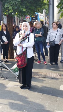 Speaking through a microphone, Martin Quigley thanked those attending the rally and after some remarks, introduced the Chairperson of the IPSC, Fatin Al Tamimi. Speaking about the right of return of Palestinians, Tamimi also said that she had relatives in both Hebron (West Bank) and in the Gaza strip and spoke about the privations of the people there blockaded by Israel, including contaminated water and lack of electricity. However not only is Israel guilty but also Egypt, as Tamimi alluded to when she said that Egypt had only temporarily opened the Rafah Crossing Gate, which Egypt maintains, for the feast of Ramadan, as a result of which she was expecting to be able to see her sister for the first time in seven years (the crowd cheered and applauded this news).