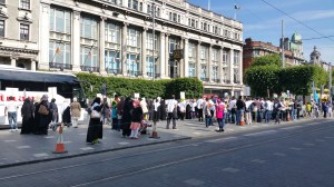 The regular blowing of horns by passing motorists, including taxis and buses, would have indicated that something of interest was happening in the city centre yesterday, Monday 5th June. As people came within sight of the centre of O’Connell Street, they could also see the Palestinian flags flying, the banners and the placards.