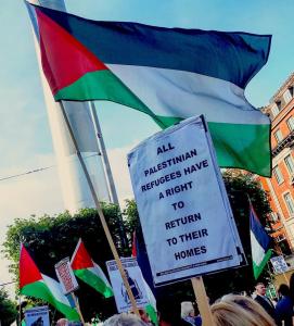 Two other Palestinian speakers addressed the rally, including one who had come out through that very Rafah crossing, Asad abu Shark who was introduced as from the Great March of Return and Ahmad El Habbash, introduced as representing the Palestinian Community in All Ireland3. All speakers drew attention to the Nakba (from Yawm an-Nakba, meaning “Day of the Catastrophe”, referring to the expulsion of thousands of Palestinians in 1948 –), to the right of return, the terrible conditions within the Gaza strip (which place, they said, would become uninhabitable by 2020 — see link), the impunity of the Israeli authorities and the inactivity of “the international community”.
