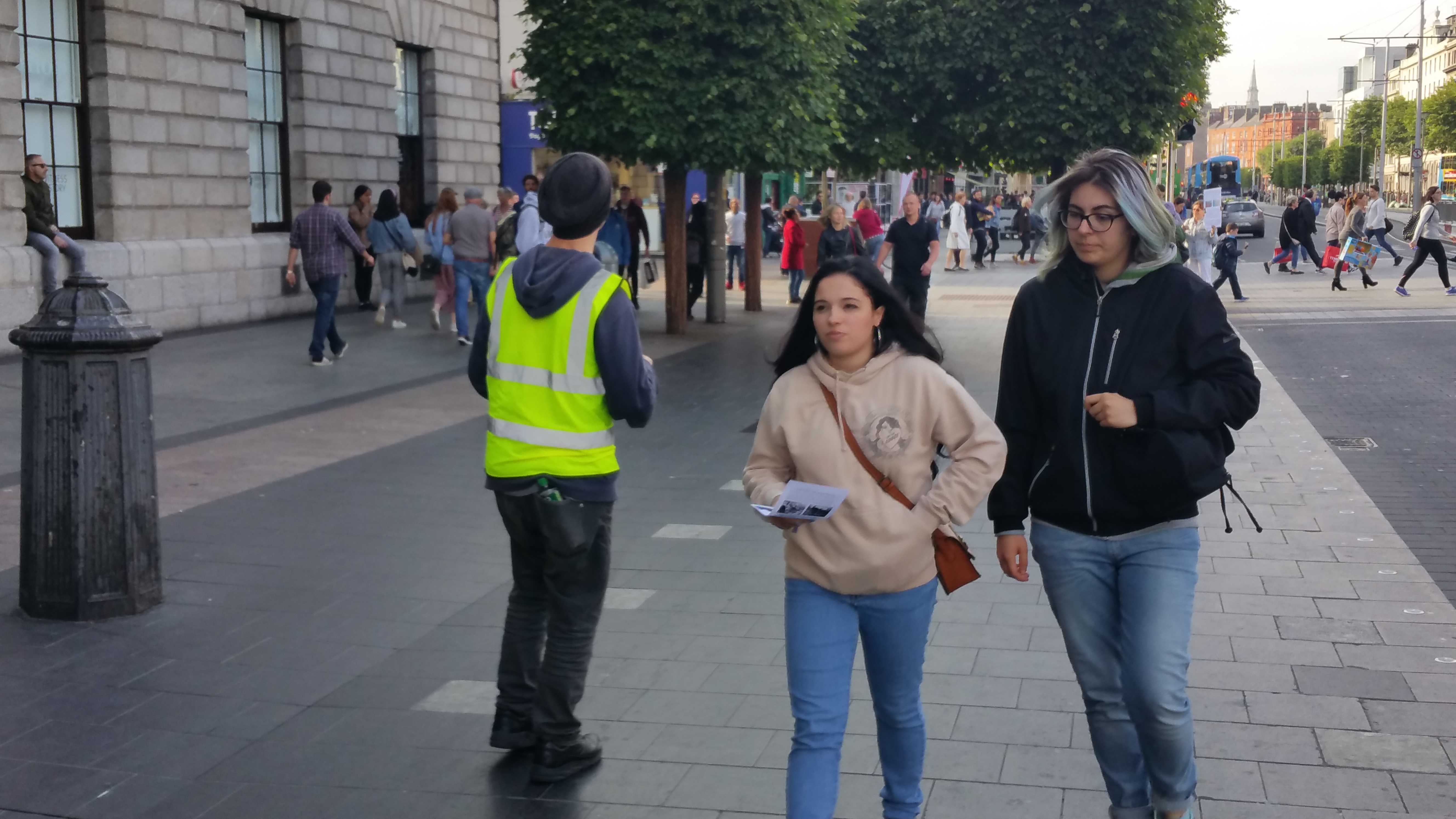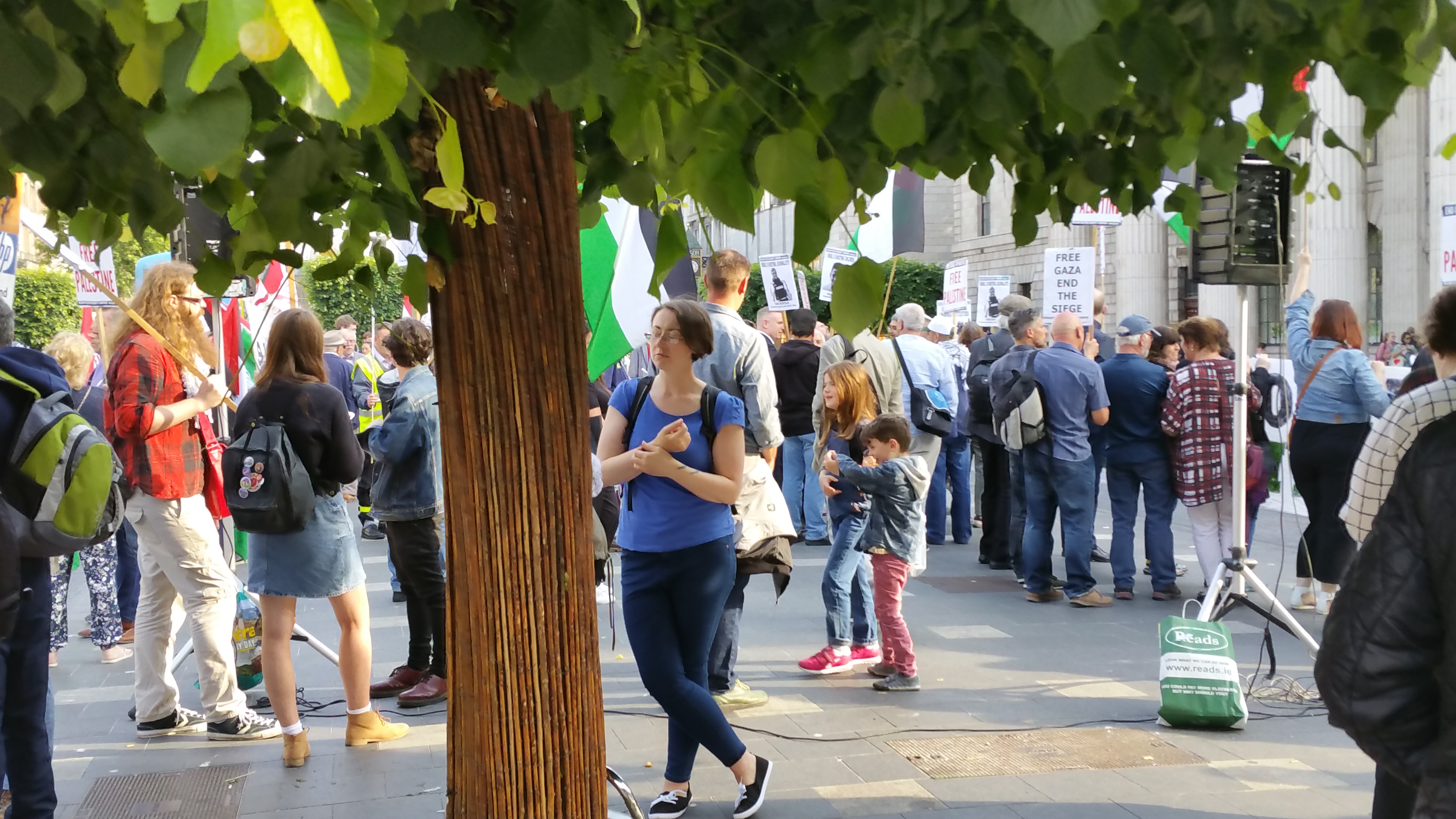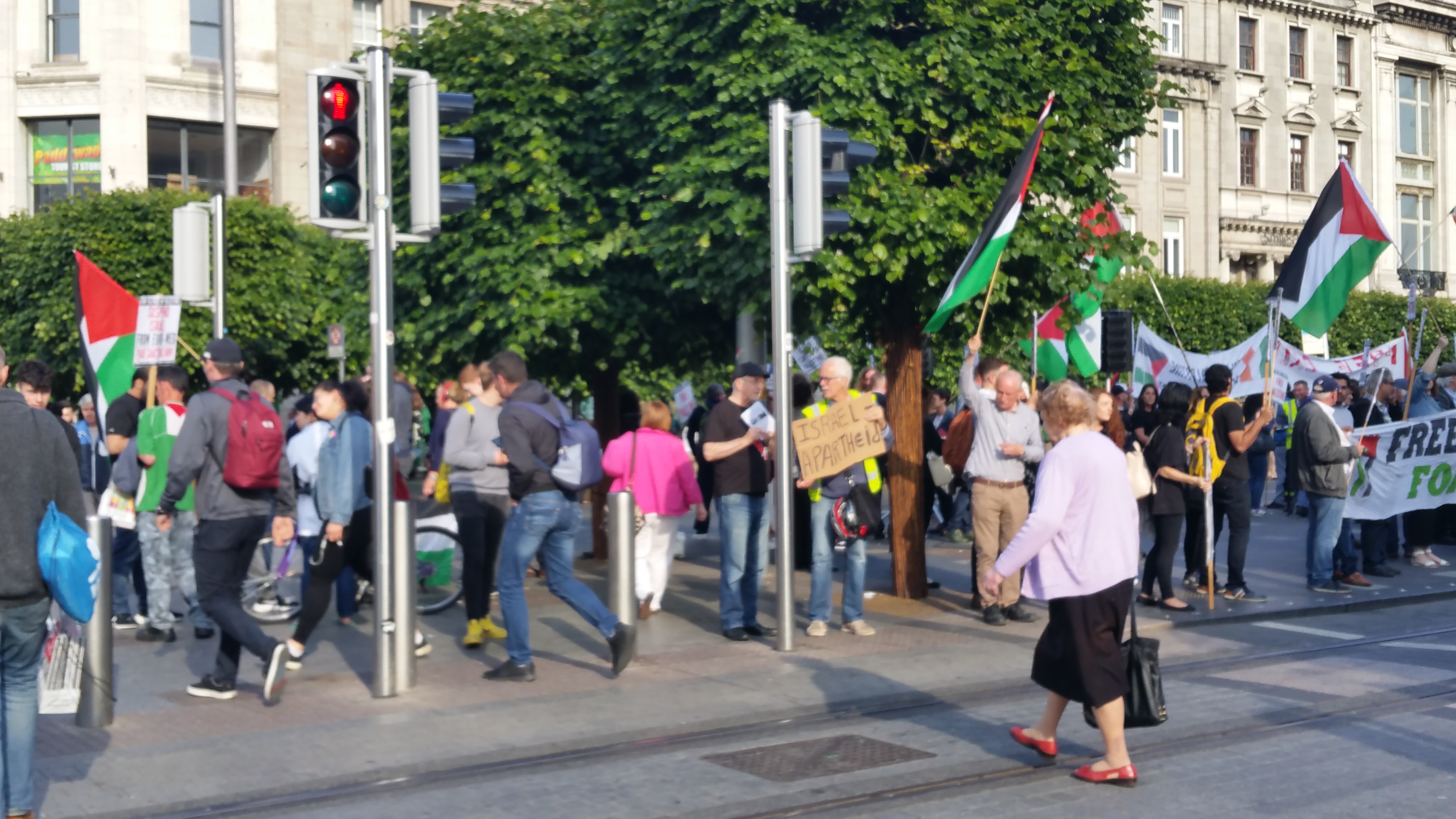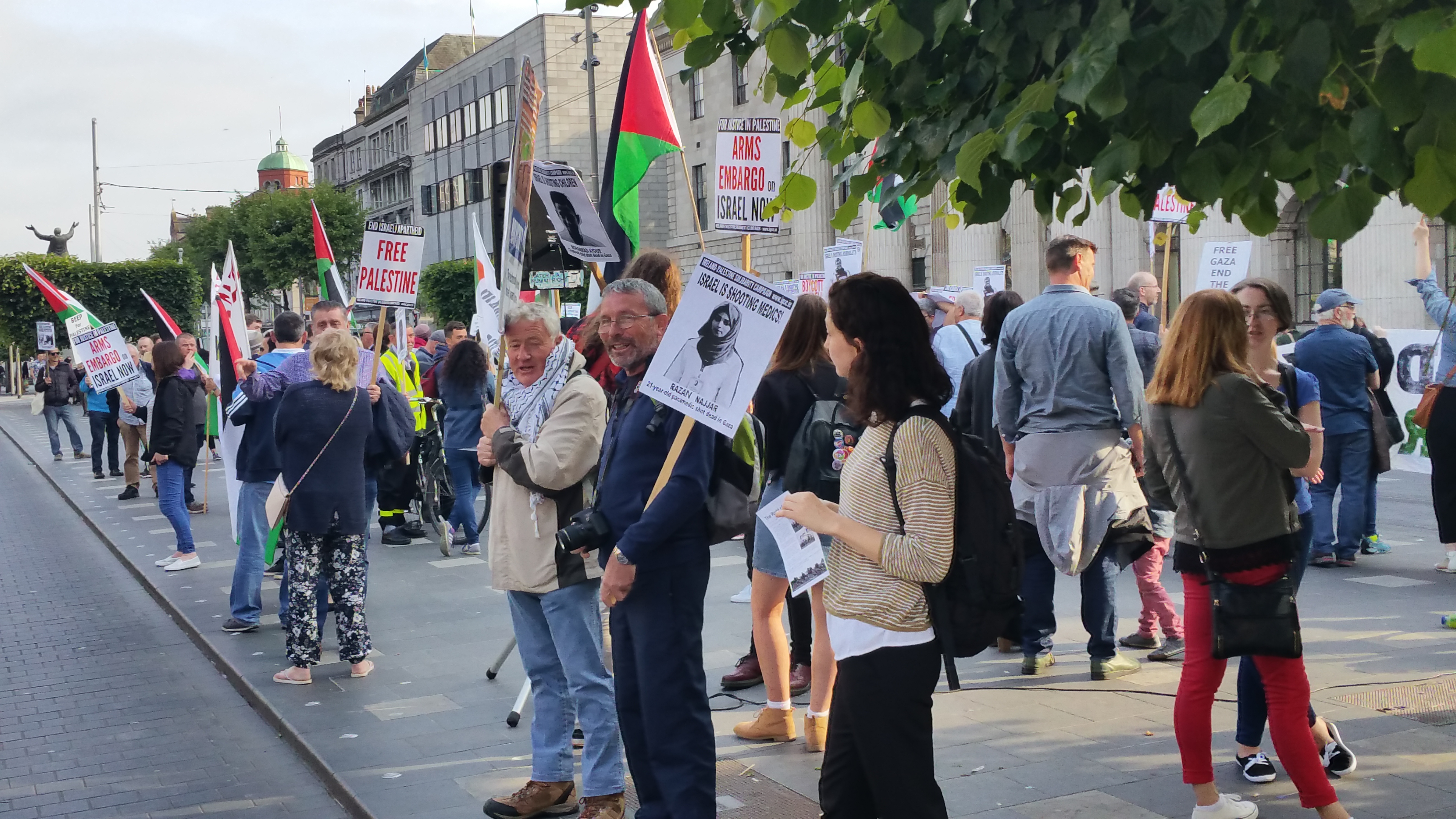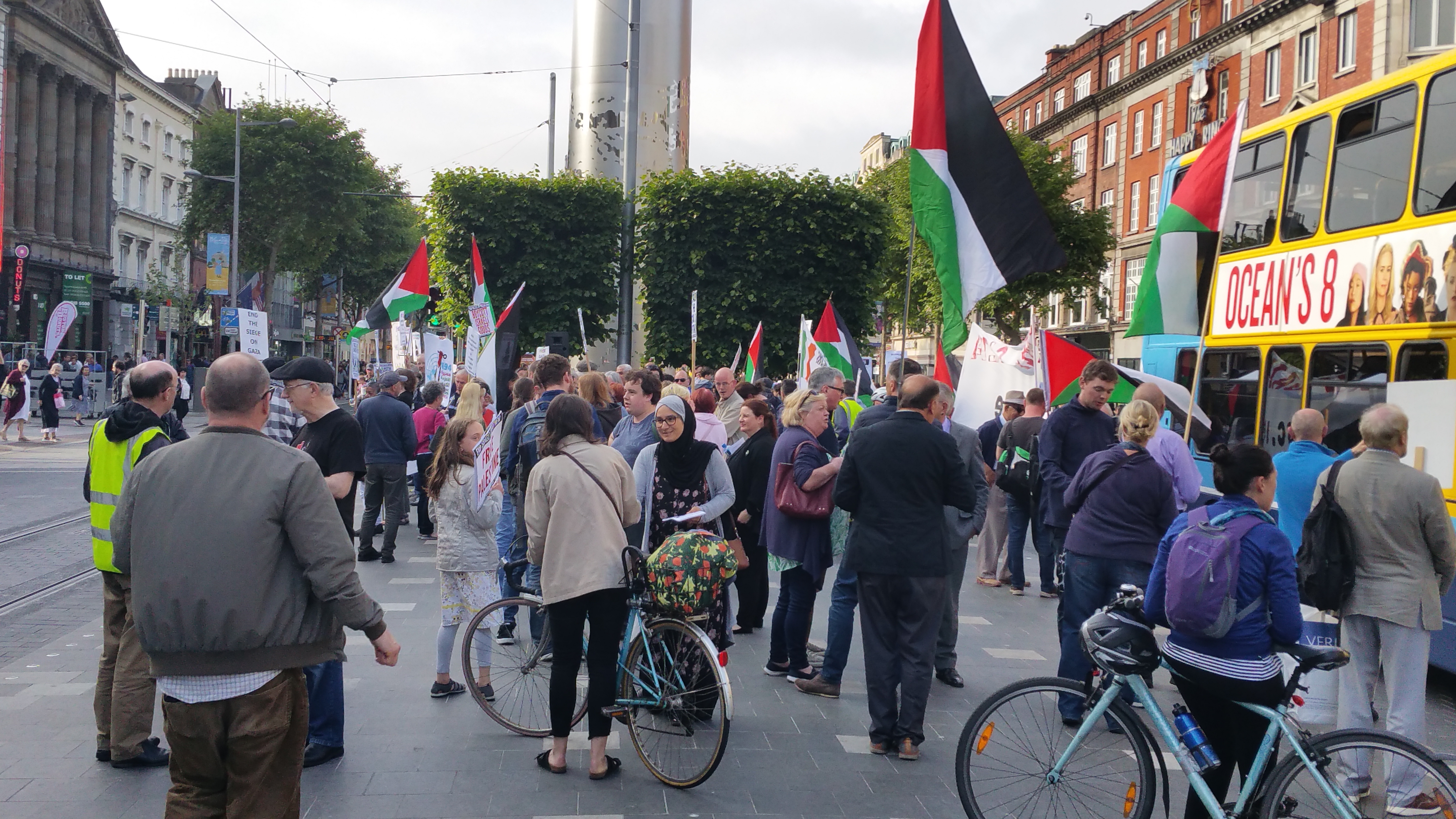 The regular blowing of horns by passing motorists, including taxis and buses, would have indicated that something of interest was happening in the city centre yesterday, Monday 5th June. As people came within sight of the centre of O’Connell Street, they could also see the Palestinian flags flying, the banners and the placards.