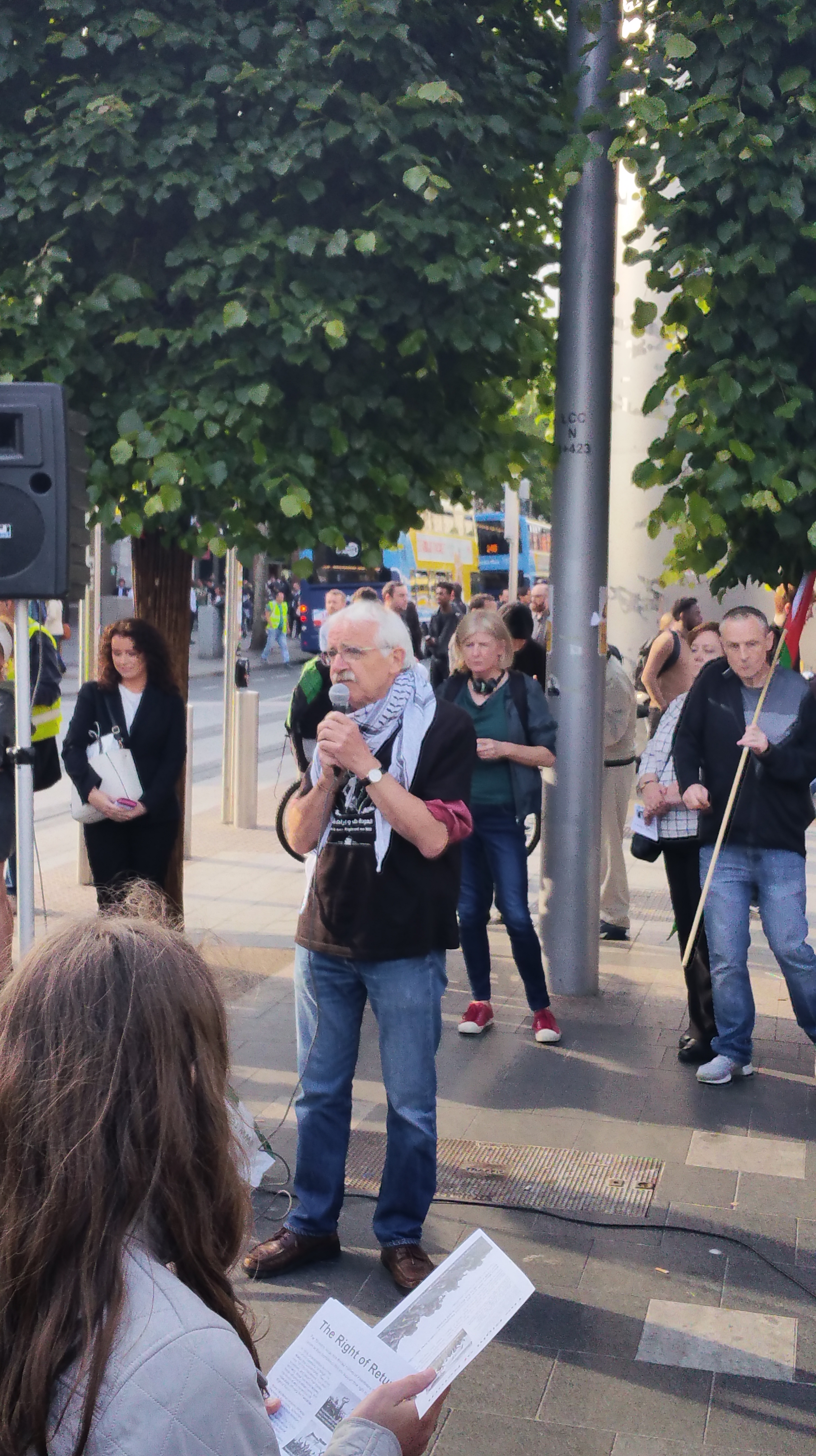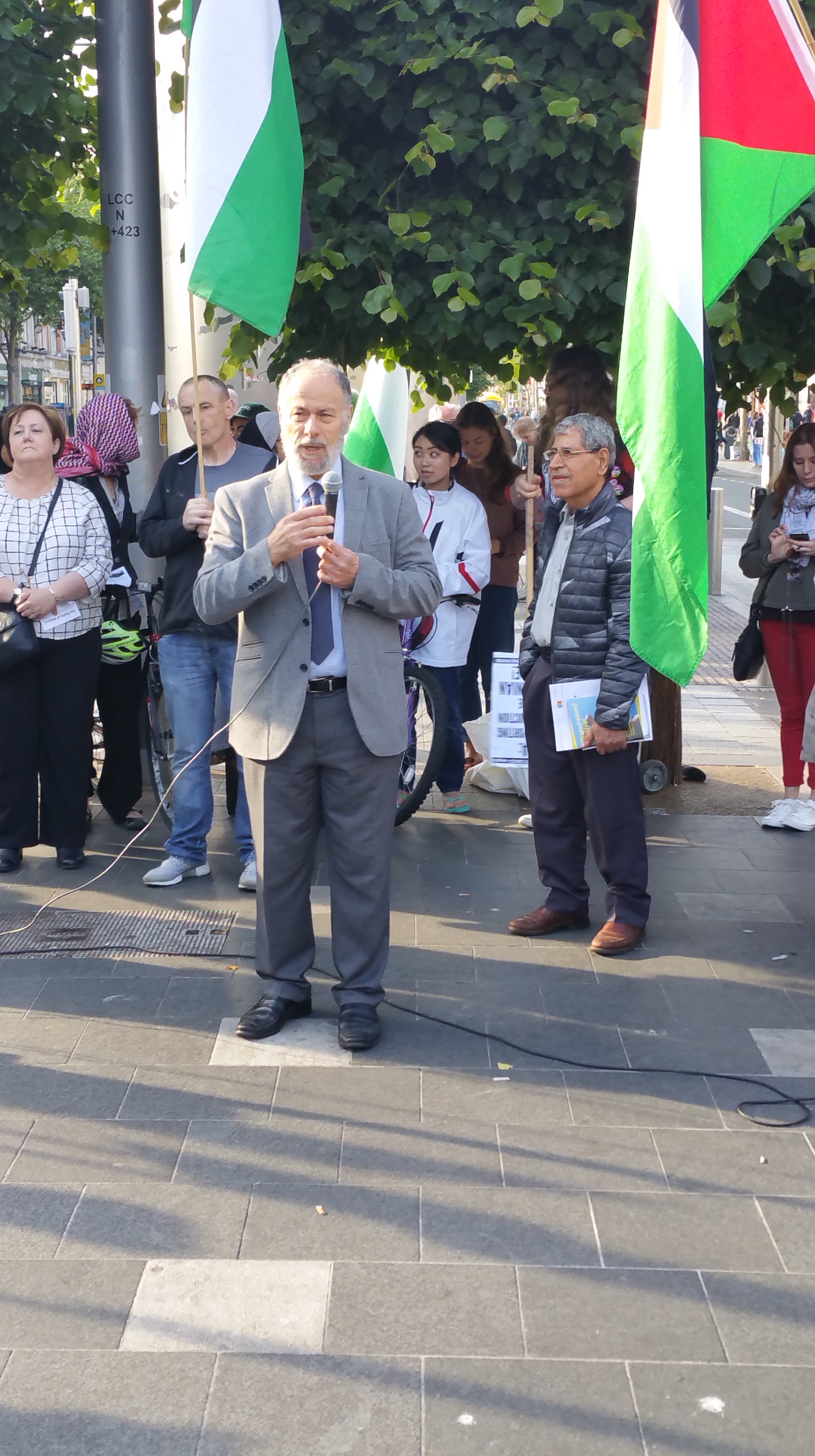 Speaking through a microphone, Martin Quigley thanked those attending the rally and after some remarks, introduced the Chairperson of the IPSC, Fatin Al Tamimi. Speaking about the right of return of Palestinians, Tamimi also said that she had relatives in both Hebron (West Bank) and in the Gaza strip and spoke about the privations of the people there blockaded by Israel, including contaminated water and lack of electricity. However not only is Israel guilty but also Egypt, as Tamimi alluded to when she said that Egypt had only temporarily opened the Rafah Crossing Gate, which Egypt maintains, for the feast of Ramadan, as a result of which she was expecting to be able to see her sister for the first time in seven years (the crowd cheered and applauded this news).