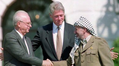 After signing the Oslo Accords in Washington, Yasser Arafat, Chairman of the PLO and Yitzak Rabin, Prime Minister of Israel, were photographed there shaking hands with US President Bill Clinton looking on approvingly, arms almost around them, like a big friendly uncle making peace between nephews. Yizhak Rabin, Shimon Perez and Arafat were jointly awarded the Nobel Peace Prize in 1994 (a prize already devalued ever since it had been awarded to notorious warmonger Kissinger).