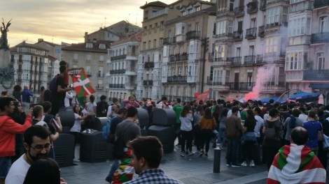 The main square of the lower old town, the Casco Viejo3, was full of people, some chanting and red flares burning with an occasional firework going off. The ikurrina, the Basque flag, waving in many places, draped over balconies etc. The square is called alternatively Plaza de la Virgen Blanca or simply La Plaza Vieja. We met up with an ex-prisoner (political) who was complaining about the impressive monument in the main square which commemorates the Battle of Vitoria, fought on June 21, 1813, between the retreating French forces of Jose Bonaparte and the English forces under the Duke of Wellington. The English won the battle. I gathered the ex-prisoner’s objection was not so much that it commemorated the defeat of the French but rather that it celebrated the ‘independence’ of the Spanish monarchy, which had done the Basques no favours since the battle and much to the contrary. We drank lager here in plastic containers and street cleaners were already out sweeping up discarded and cracked containers.