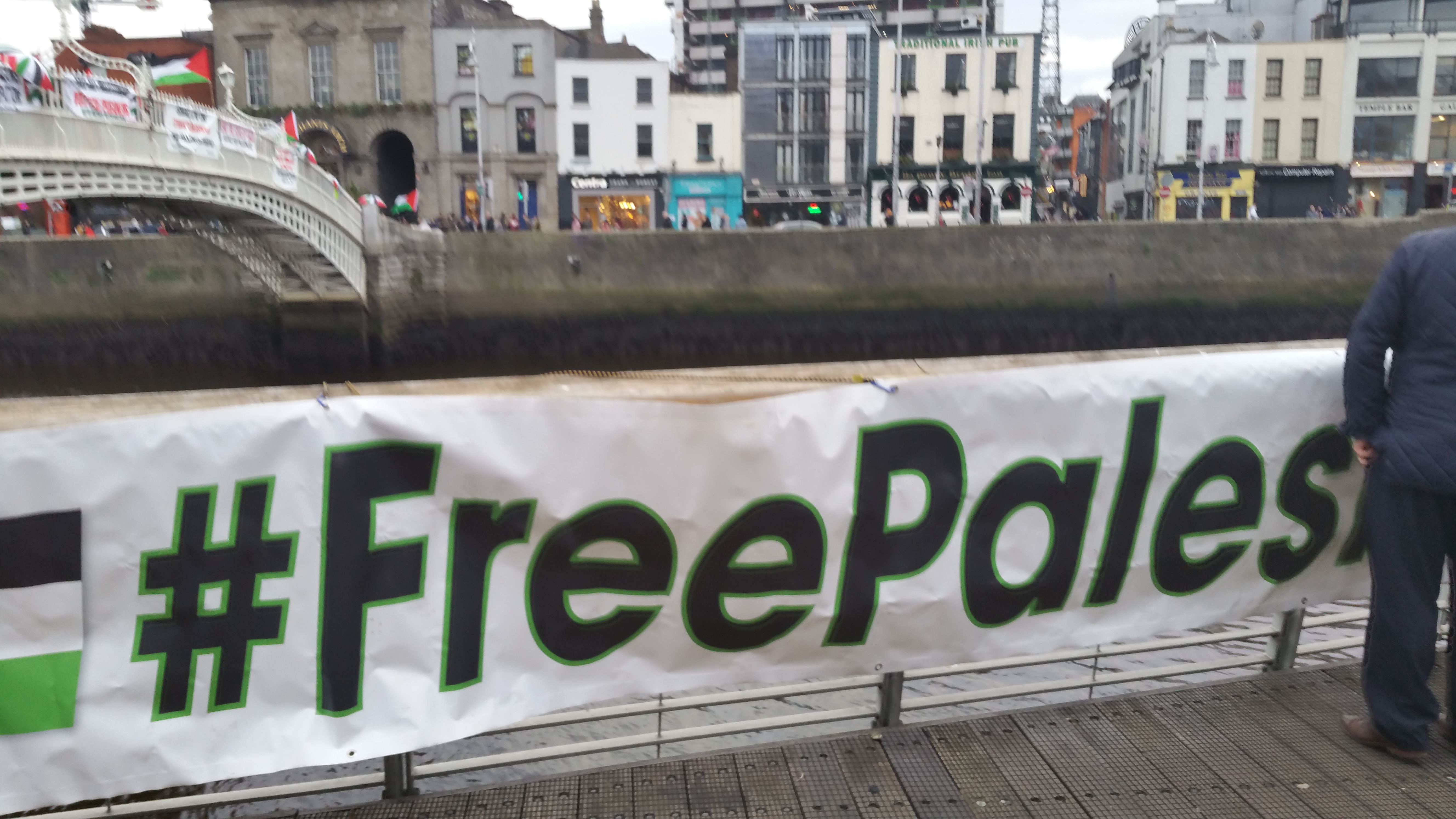 Some chanting of Palestinian supporters could be heard as well as occasional passing drivers tooting their horns in solidarity, occasionally with a clenched fist also raised outside the window. A counter-protest planned by the zionist Irish Friends of Israel on Essex Bridge however failed to materialise.