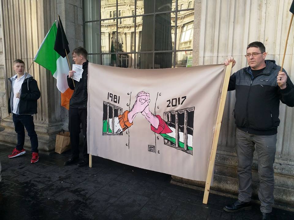 DUBLIN PICKET PROTESTS CONTINUING INTERNMENT IN IRELAND WHILE EXPRESSING INTERNATIONALIST SOLIDARITY WITH PALESTINIAN PRISONERS.