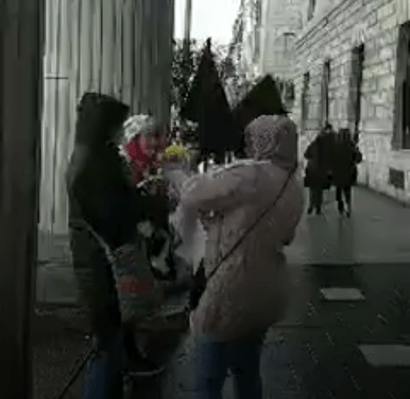 The picketers distributed leaflets to passers-by, some of which took photographs. Two young women who had taken photographs returned a second time, one of them presenting a bouquet of flowers to the surprised protesters. She said that she was doing so in gratitude for she was of Palestinian backround.