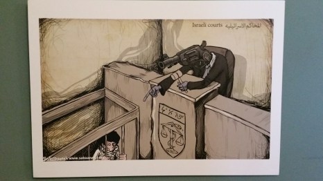 After the rally, of which I just caught the tail end because of the weekly Save Moore Street From Demolition campaign duty, I managed to catch the exhibition of noted Palestinian political cartoonist Mohammad Saba’aneh and to buy his book PALESTINE in black and white. Sadly, a prior appointment meant I had to miss his talk, which I would have loved to attend, especially as I dabble a little in cartoon-drawing myself.
