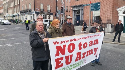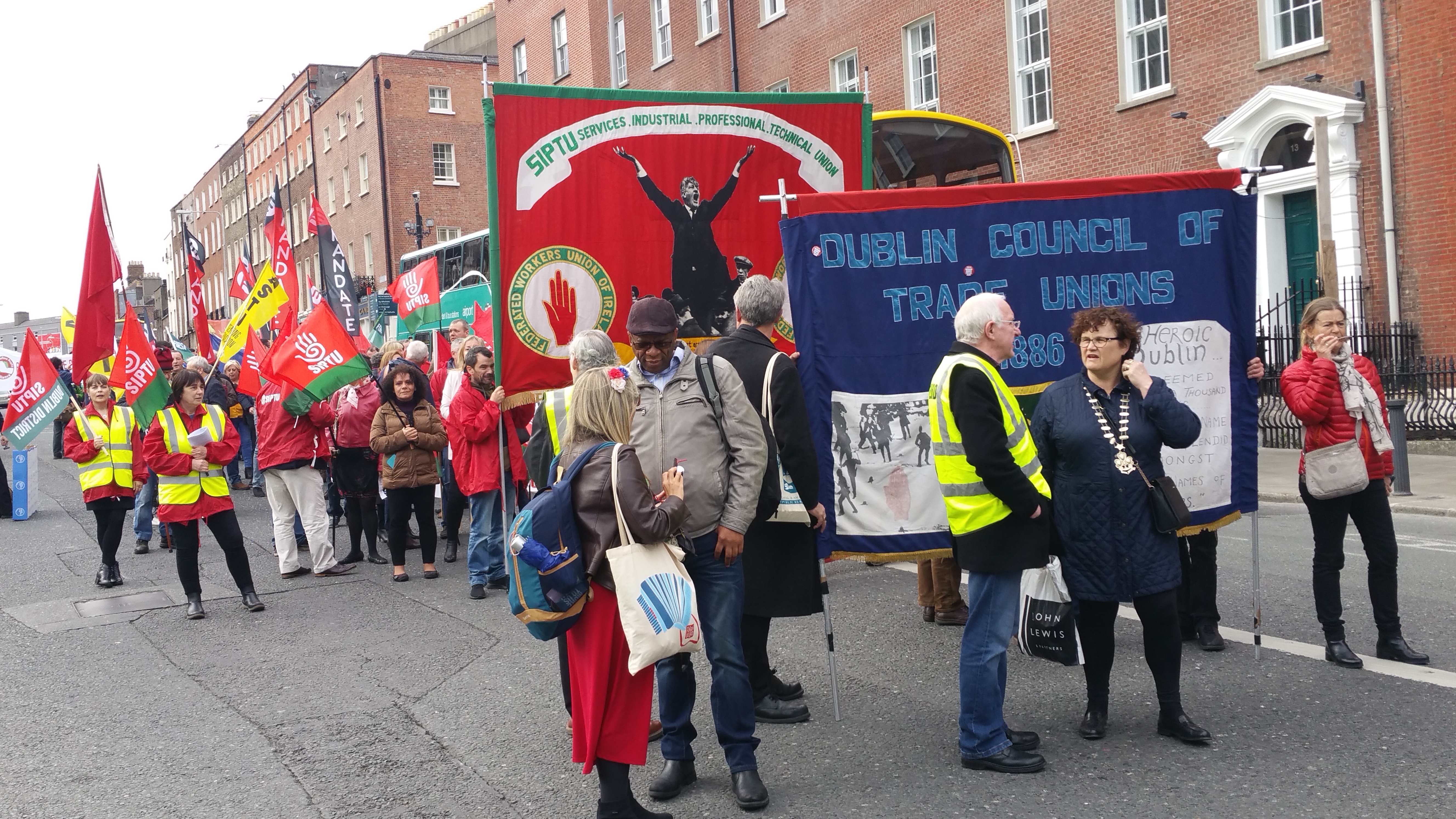 Banners of some unions mixed with those of political organisations and campaign groups, including the Ireland Palestine Solidarity Campaign and another against Irish state participation in PESCO, which is seen by many as an embryonic EU Army and undermining the Irish state’s neutrality.