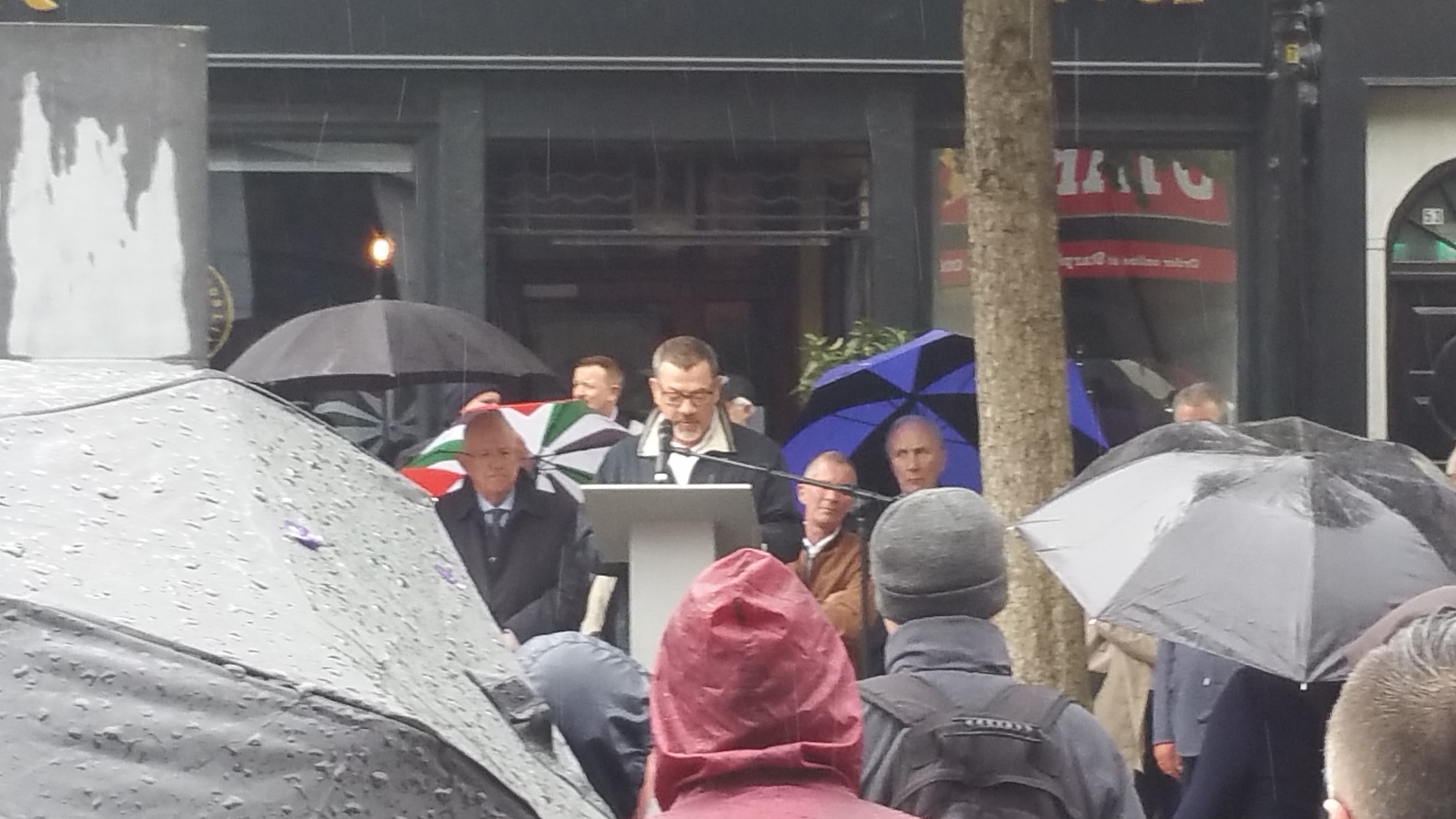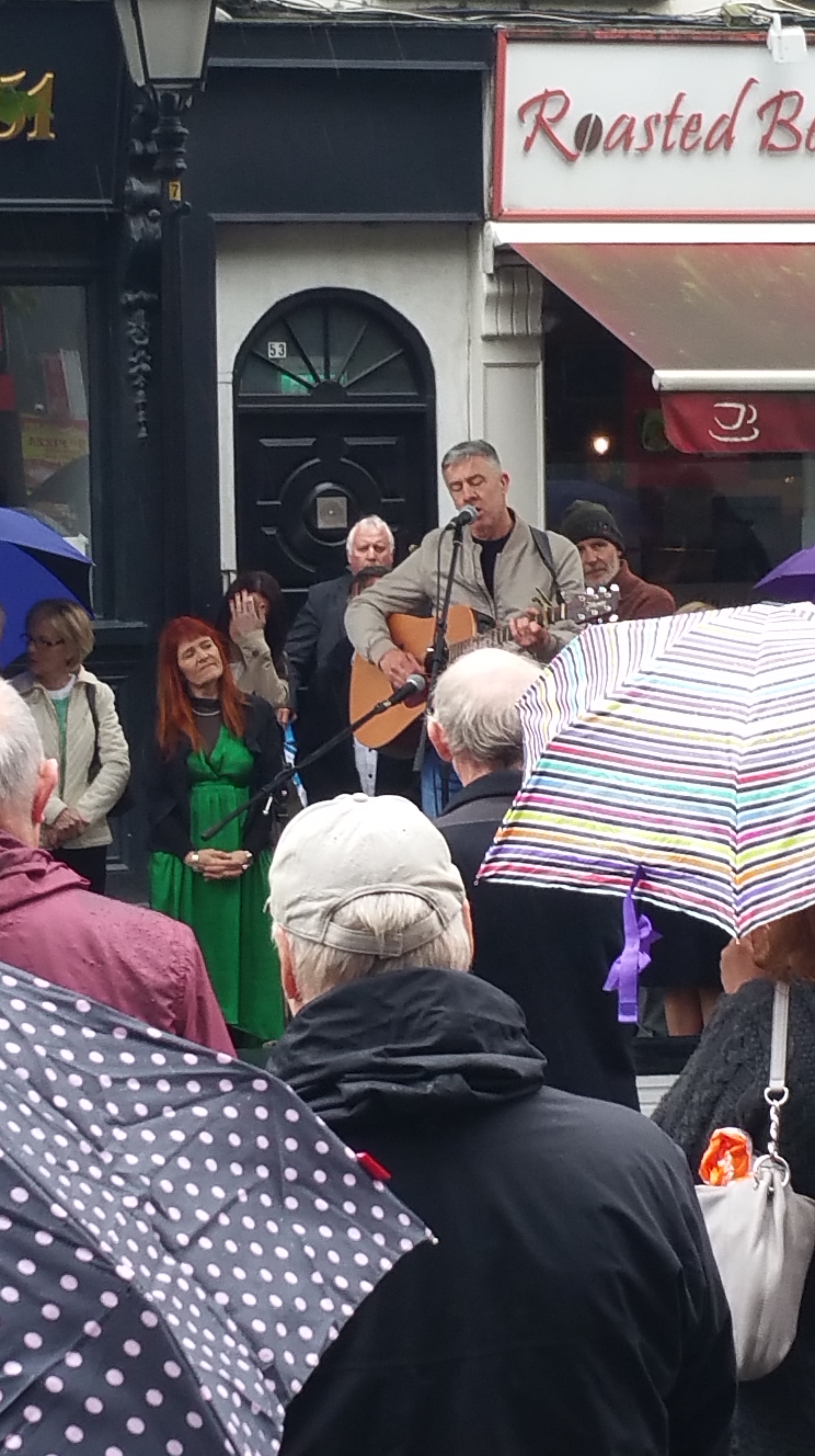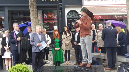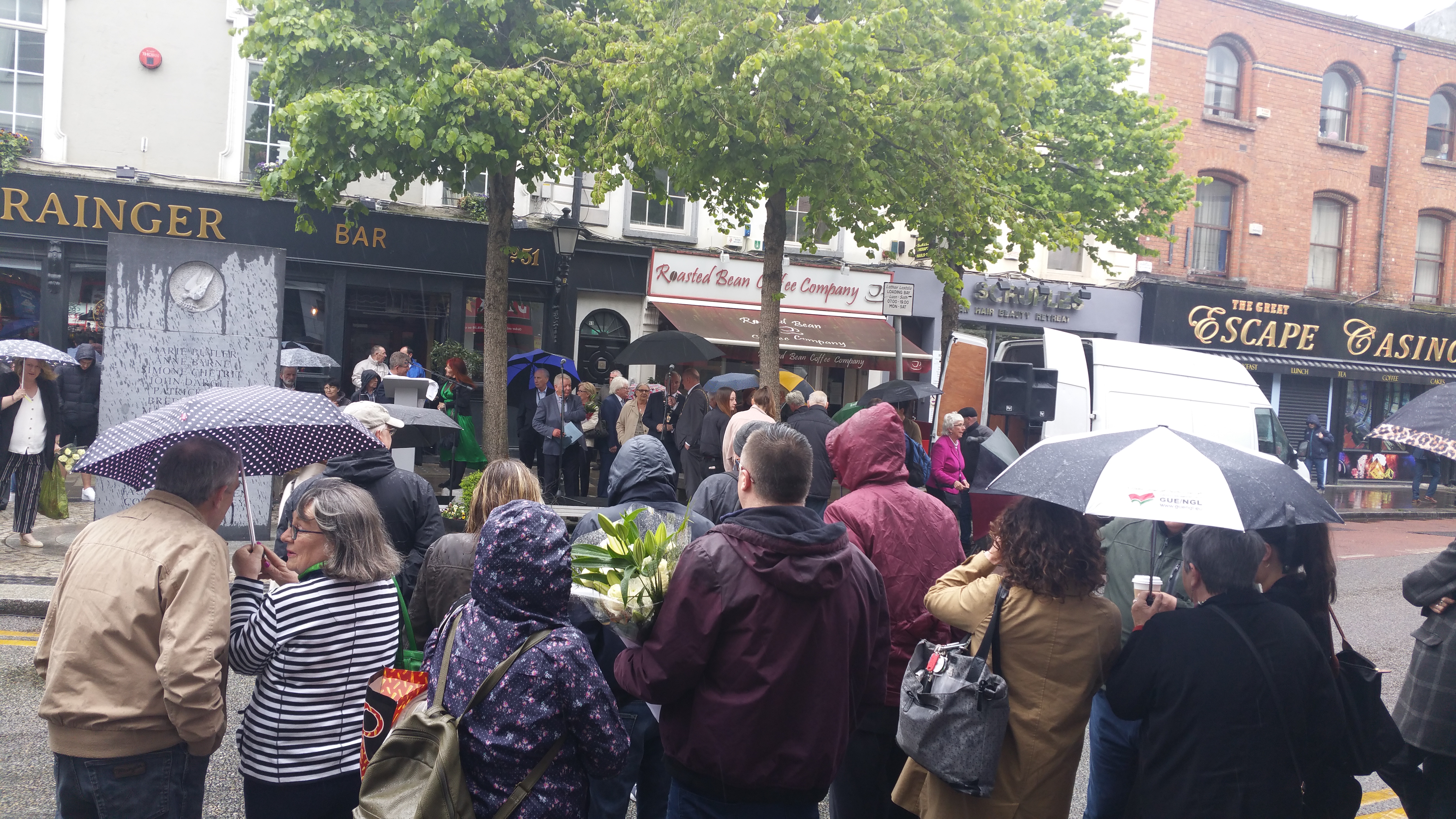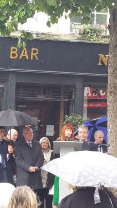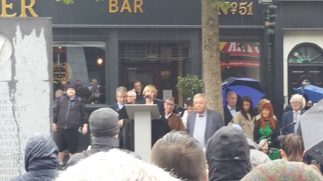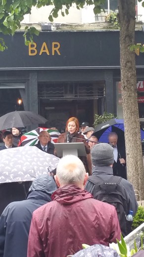 A crowd had gathered at the Dublin and Monaghan Bombings Monument in Talbot Street for some time before the event was due to start on the 17th May. Aidan Shields, whose mother Maureen was killed in in Talbot Street, acted as the master of ceremonies and, after saying a few words about the bombings and the campaign, outlined the course the proceedings would follow, apologising also to those who had to stand in the rain.