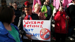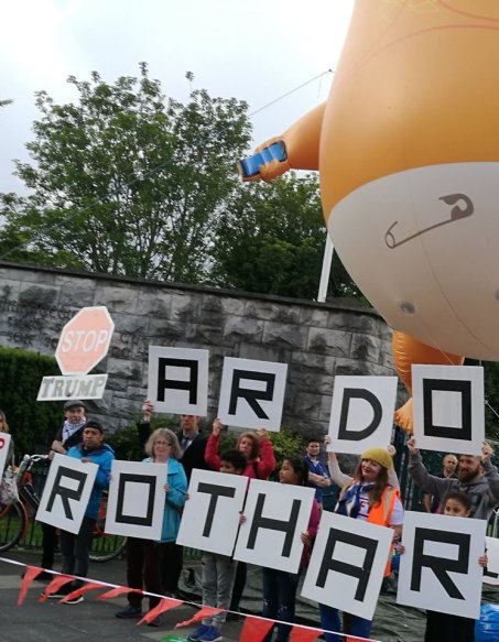 Dublin had a showy and packed anti-Trump rally, with a Baby Trump blimp floating above the crowd outside the Garden of Remembrance. An activist brought big letter placards which, with the help of volunteers from the crowd, spelled out anti-trump messages in English and in Irish. Indeed an interesting feature was a number of placards partly or completely in Irish.