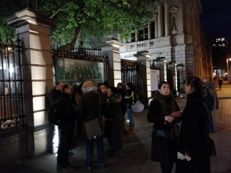 line up in Kildare St. below a photo of the First Dáil 1919.