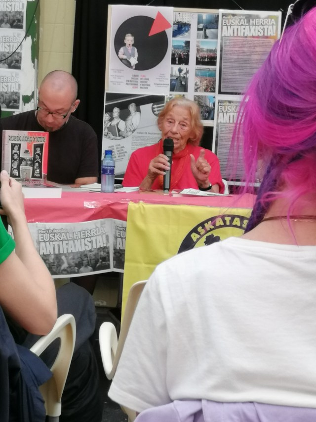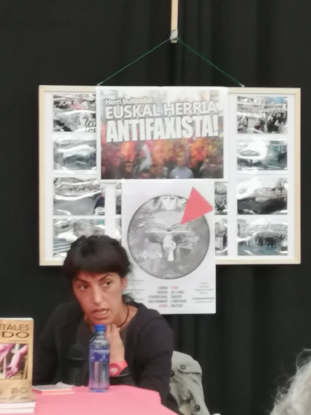 An anti-fascist bookfair was held in Portugalete1, not far from Bilbo (Bilbao) in the southern Basque Country on Saturday 29th and Sunday 30th September. There was ample room for the many stalls in the old disused indoor market in the town’s Casco Viejo (old town quarter), along with a curtained-off play area for children. One of the events in the two-day bookfair was a launch of the translation into Castillian (Spanish) of D’Arcy’s book “Tell Them Everything”(“Di Les Todo”). The translation was published by Sare Antifascista, one of the organisers of the bookfair and D’Arcy spoke in English at the launch, her talk translated into Castillian; also speaking was Basque ex-political prisoner Ziortza Fernandez Larrazabal.
