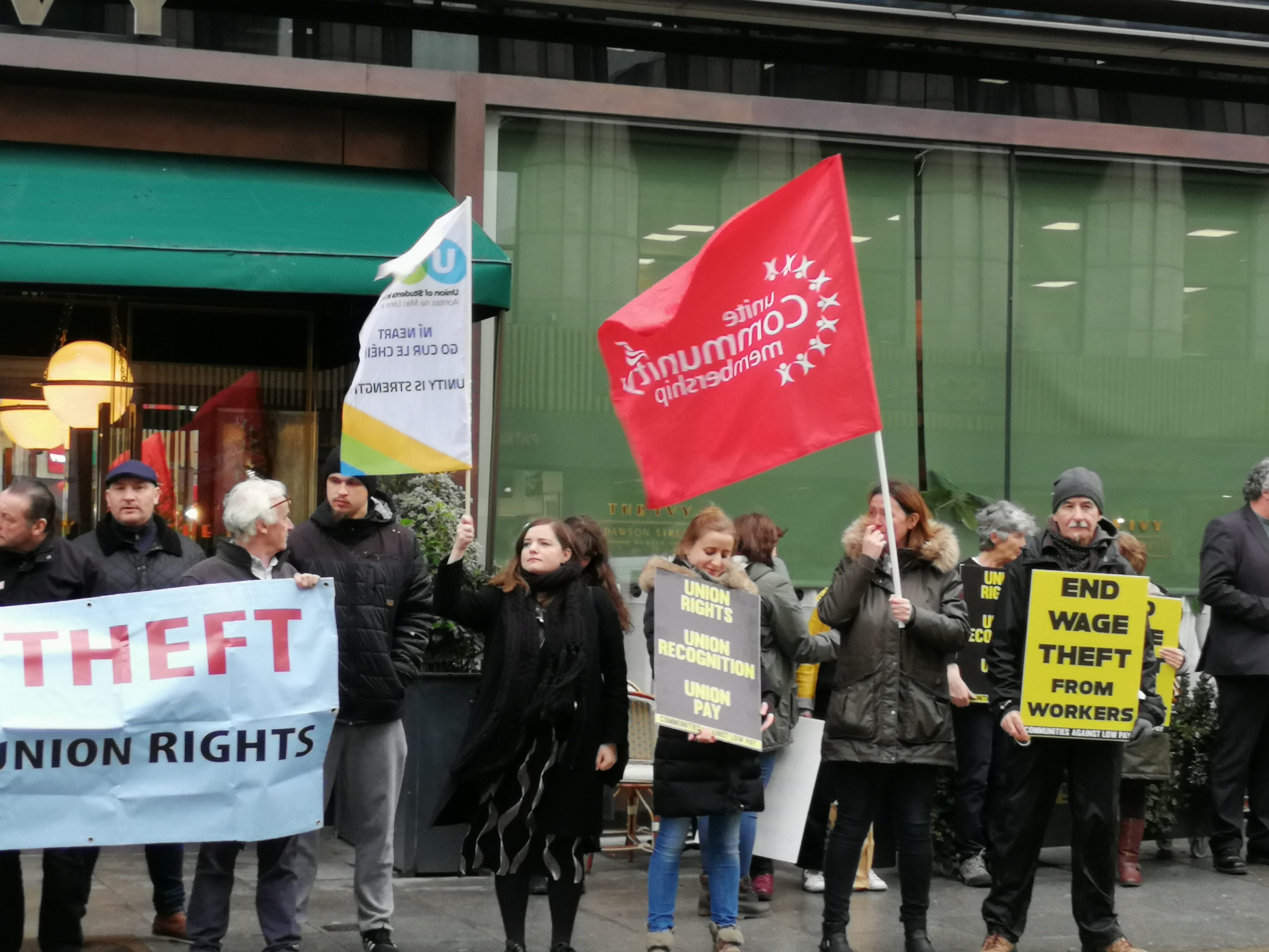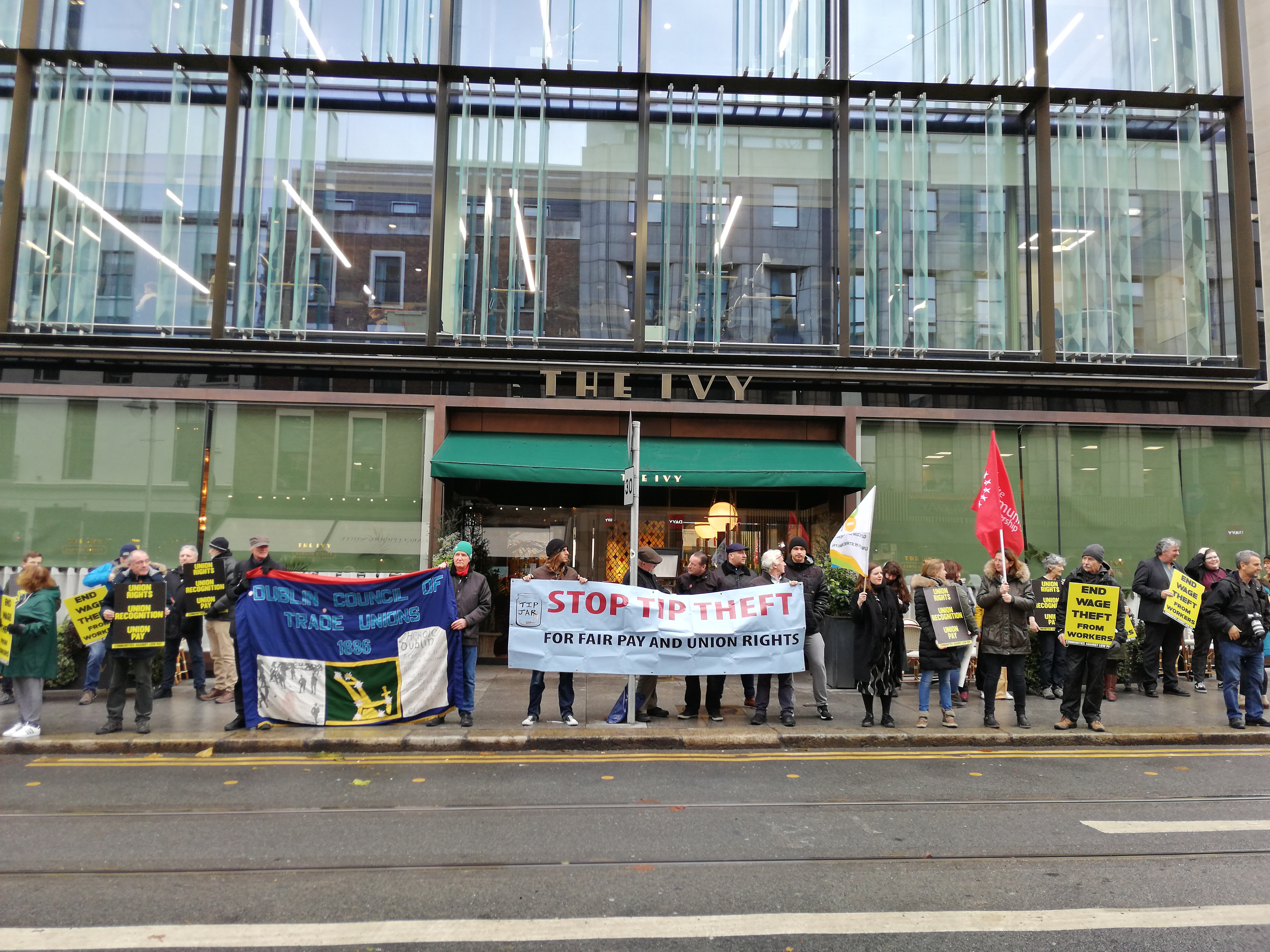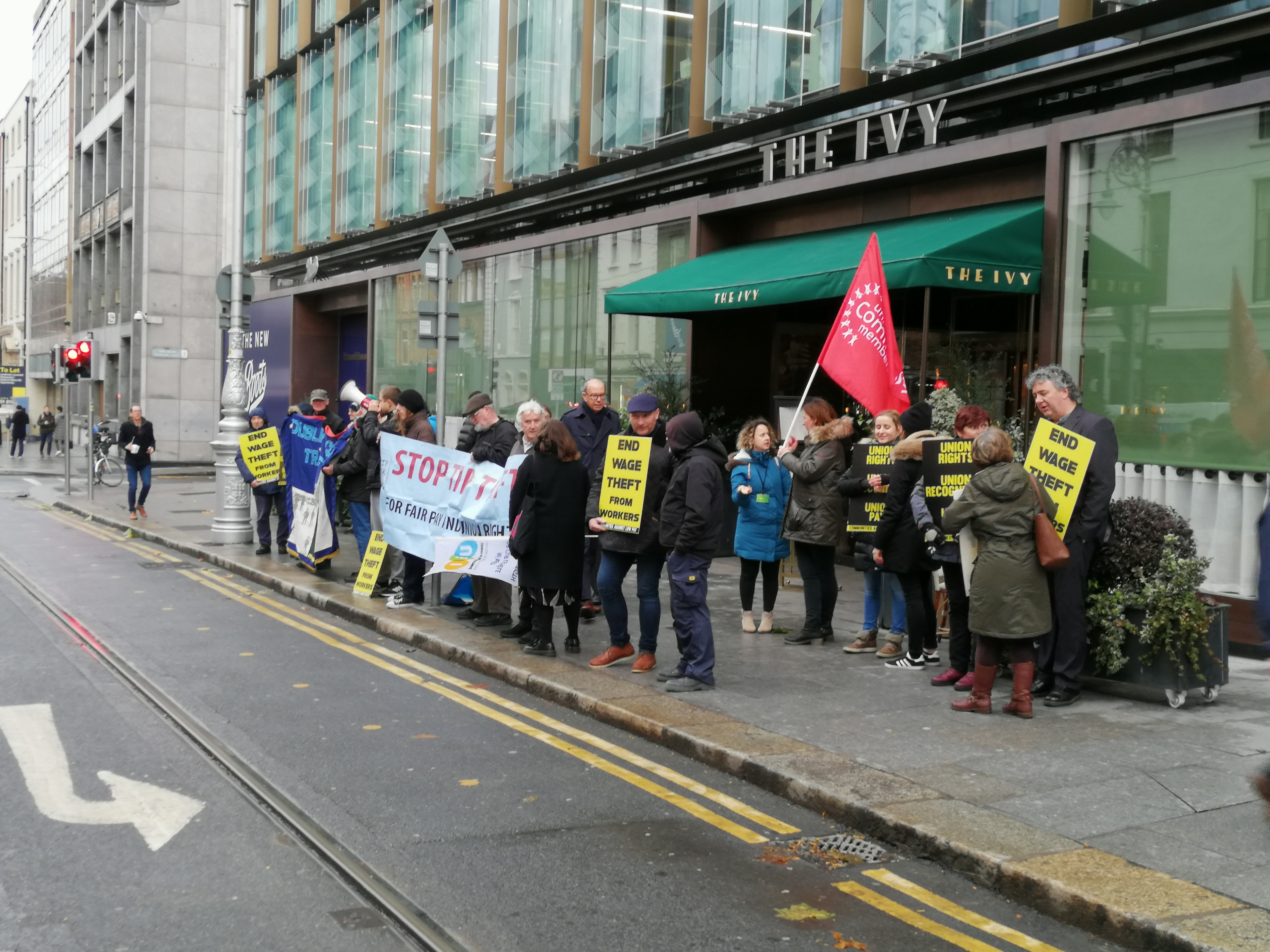 The Ivy Restaurant management in Dublin’s Dawson Street at one o’clock this afternoon ordered the blinds to be pulled down on the windows. This is their usual response when demonstrators arrive to picket their restaurant, as they did today. The Ivy restaurant is part of a profitable chain and in Dublin at least is using tips paid to staff by customers to help make up the staff’s wages. Bluntly, stealing tips that were paid for service by customers who assumed they were in addition to wages already received (which, as everyone knows, are low enough in the “hospitality” trade).
