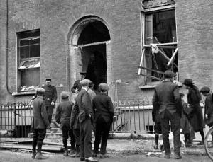 In a rage at the defence by the residents of Corporation Flats of people fleeing the police charge on Eden Quay, the DMP returned there on the 31st, leaving hardly a door or stick of furniture unbroken or person unbeaten, including women and children.