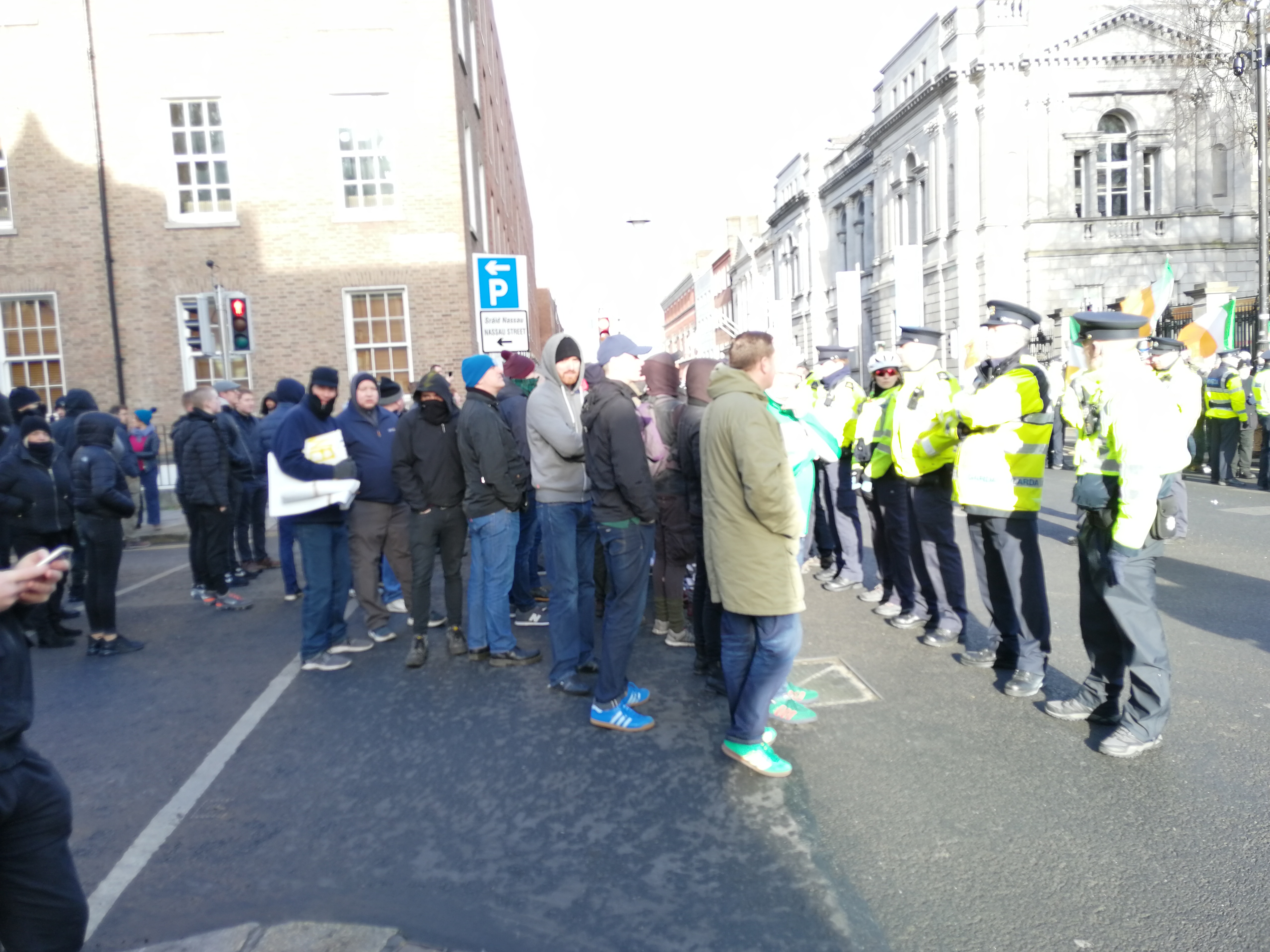 The far-Right rally had been scheduled for 1.00pm and at 2.15 pm they left, having begged the Gardaí for an escort, with which they were provided. Meanwhile, the riot police prevented the anti-fascists from following them.