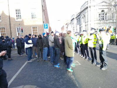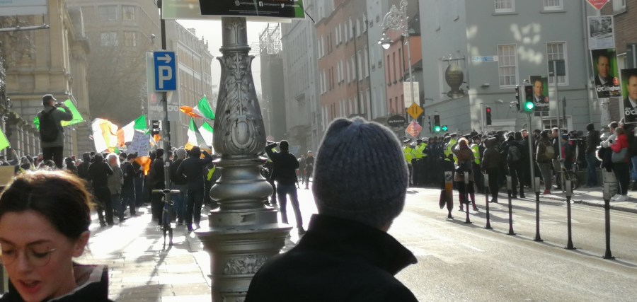 After weeks of propaganda and whipping up their support, a much-reduced turnout of the Irish far-Right lined up in front of Leinster House on Saturday 1st February and were confronted by an anti-fascist, anti-racist opposition a little smaller in size but which had been convened by word of mouth alone. There were some scuffles and a couple of arrests and the far-Rightists begged for a Garda escort to leave their protest after little more than one hour.