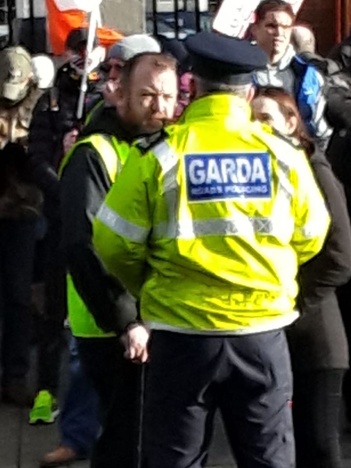 At one point, a surge developed among the anti-fascists towards the south of their numbers and the general Gardaí and Public Order unit (the Gardaí are the police force of the Irish state) charged the anti-fascists with batons drawn, with which they struck a number of antifascists. A man reported to be a fascist, on the steps outside a building on the same side of the street as the antifascists, was seen lashing out downwards, presumably at antifascists, with a pair of crutches. At that point the Gardaí restrained him and later it seems arrested him but apparently they had already arrested an anti-fascist. Most of the police dived at the anti-fascists during this brief episode and a few activists were rescued from police hands. However, a fascist who crossed the road from the Leinster House side with a stick, who took a number of swings at anti-fascists, was escorted back across the road by Gardaí, apparently without any attempt to arrest him.