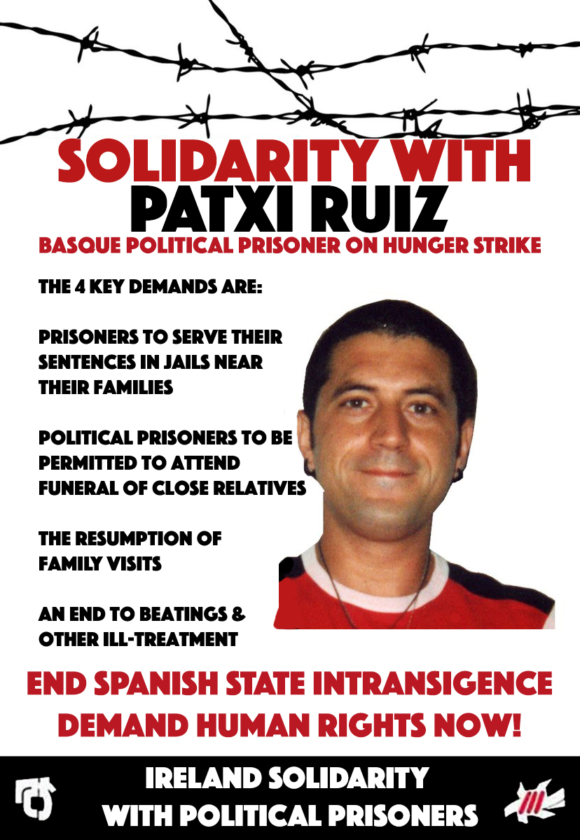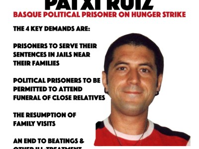 Patxi Ruiz is one of around 200 Basque political prisoners serving sentences in the Spanish and French states, almost invariably, in jails far from their homes, their families and friends, if not too sick, elderly or too young, having to travel long distances to visit them. Ending the dispersal policy was one of Ruiz’s demands, the end of beatings by warders another. He also called for the automatic right to attend funerals of close family (he had been denied permission to attend his father’s funeral) and the resumption of family visits. It is not known whether any of those demands have been conceded but thought unlikely.