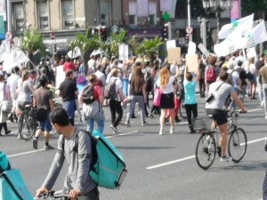 Meanwhile the sun beat down and air felt heavy, even by the riverside. Some of the attendance were visibly wilting. By the time the march crossed to the south bank and turned west, a number of people had dropped out. On O’Connell Bridge, the leaders stopped the march, which now blocked it to north-south traffic and vice versa. Here there were some further speeches, also not short, a song of which it was difficult to make out the words and a spelling out of slogans on giant letter placards, which was a welcome distraction. But still the sun beat down and there was a substantial way to go yet. Some more people left the march here.