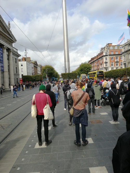 A number of speakers addressed the rally though the sound did not carry very well towards the rear of the rally but also many were distracted by keeping an eye out for fascists. One IYV activist approached the rally to photograph participants and soon got into an altercation with them, whereupon Gardaí arrived and removed him to the side of the road. Another brandished a placard, which was promptly seized by antifascists and torn. Some fascists were seen passing by, presumably on their way to Custom House Quay or Leinster House – one was observed carrying a thick length of wood with the Irish Tricolour attached to it — but did not engage with the antifascists.