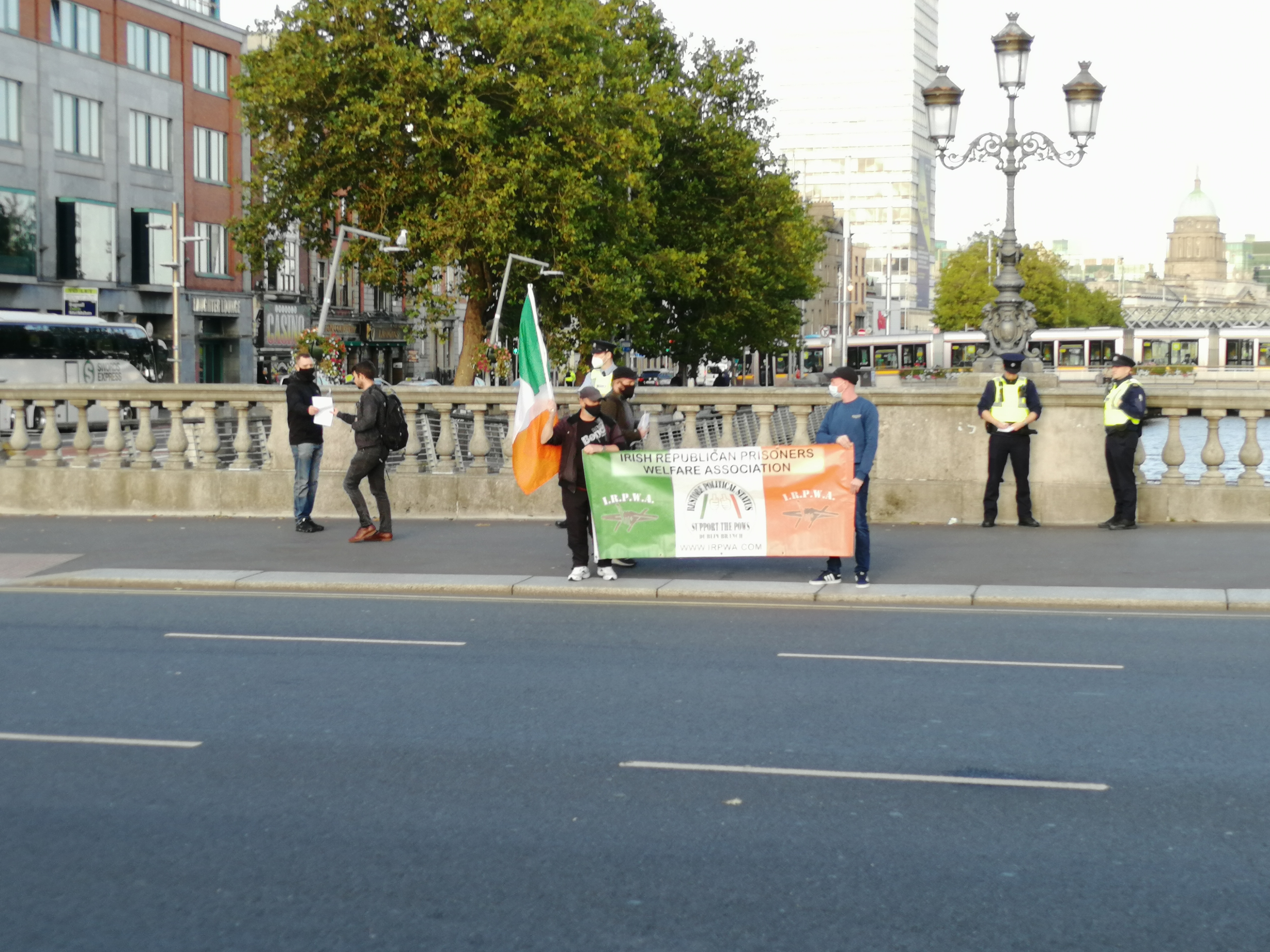 Over 30 Irish Republicans and independent socialists responded to a short-notice call by Saoradh and the Irish Republican Prisoners’ Welfare Association to assemble in Dublin to highlight the hunger-strike. The picket was held on O’Connell Bridge and received some support from passing vehicle drivers and pedestrians, with others interested in reading the leaflet being distributed or hearing the reason for the picket.