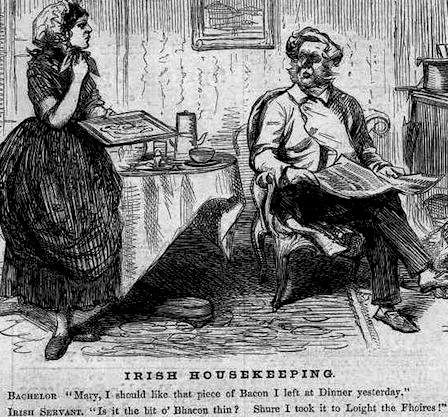 Americans often complained about Bridget’s lack of knowledge and her limitations. Americans spread negative stereotypes of Irish servants’ ignorance, rawness and stupidity. Many Irish had gone barefoot in Ireland and had to adapt to wearing shoes in America. Irish servants were sometimes even ignorant of the names and uses of kitchen utensils. One source noted, “these Irish servants are the plague of our lives.”