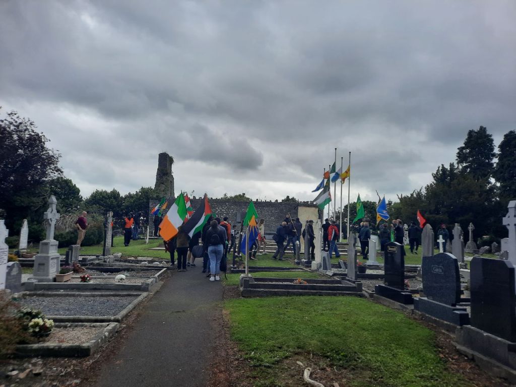 The anti-imperialists and socialist Republicans gathered in the Bodenstown area, Co. Kildare on Saturday 26th to commemorate “the Father of Irish Republicanism” at Wolf Tone’s graveside were fortunate in having a day overcast but remaining dry. A number of flags were flown in addition to the traditional Irish Republican ones and more than half the attendance was of young people. A few speeches were given, interspersed with songs and the organisers commented that attendance this year was a quintupling of that of the year before. The event was organised by the Seamus Costello Memorial Committee and such pilgrimages are part of a long tradition in Ireland.