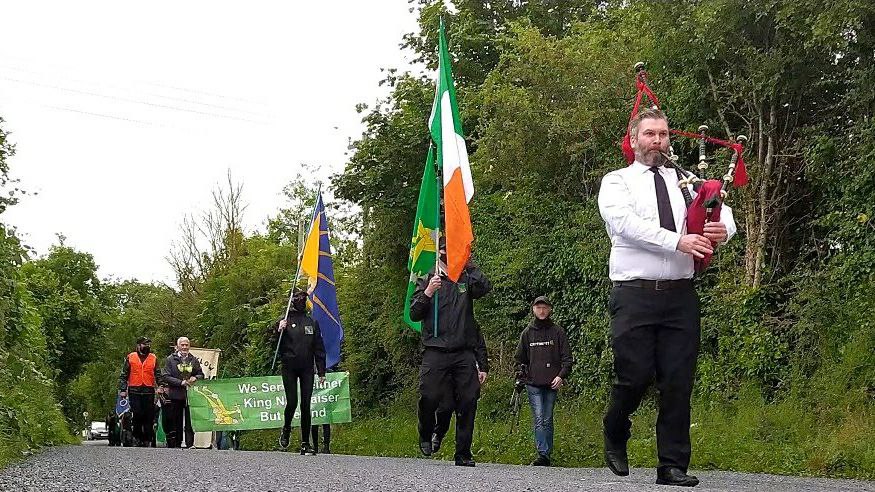 Supporters formed up at a nearby road junction and in files, with flags and banners and led by a lone piper playing marching tunes, paraded to the cemetery. The parade entered and then formed up in front of the memorial where they were welcomed and the order of events, speeches, song and wreath-laying, was outlined by the chairperson of the event.