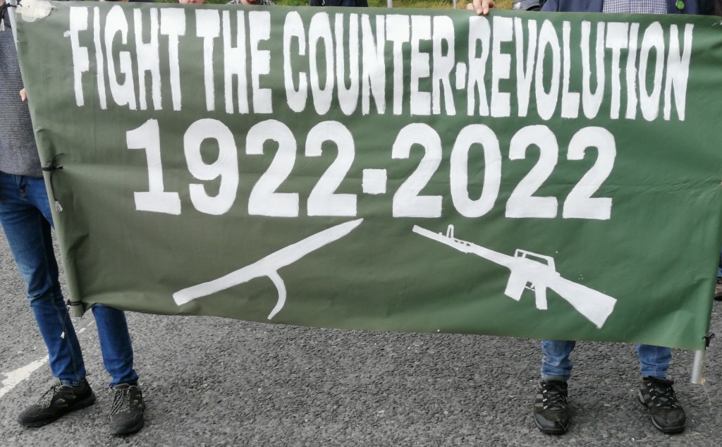 Music and lyrics are an important part of the Irish Republican tradition, the MC commented, before calling up singers to perform at intervals between speakers. Seán Óg accompanied himself on guitar singing the Irish Republican ballads Tone Is Coming Back Again and Soldiers of ‘22. The latter song was one of a number of references by speakers to the counterrevolution of 1922-1924, more usually referred to as the Civil War. The MC commented that the Tone Is Coming Back4 song is rarely heard these days and Soldiers of ‘225 not often enough.
