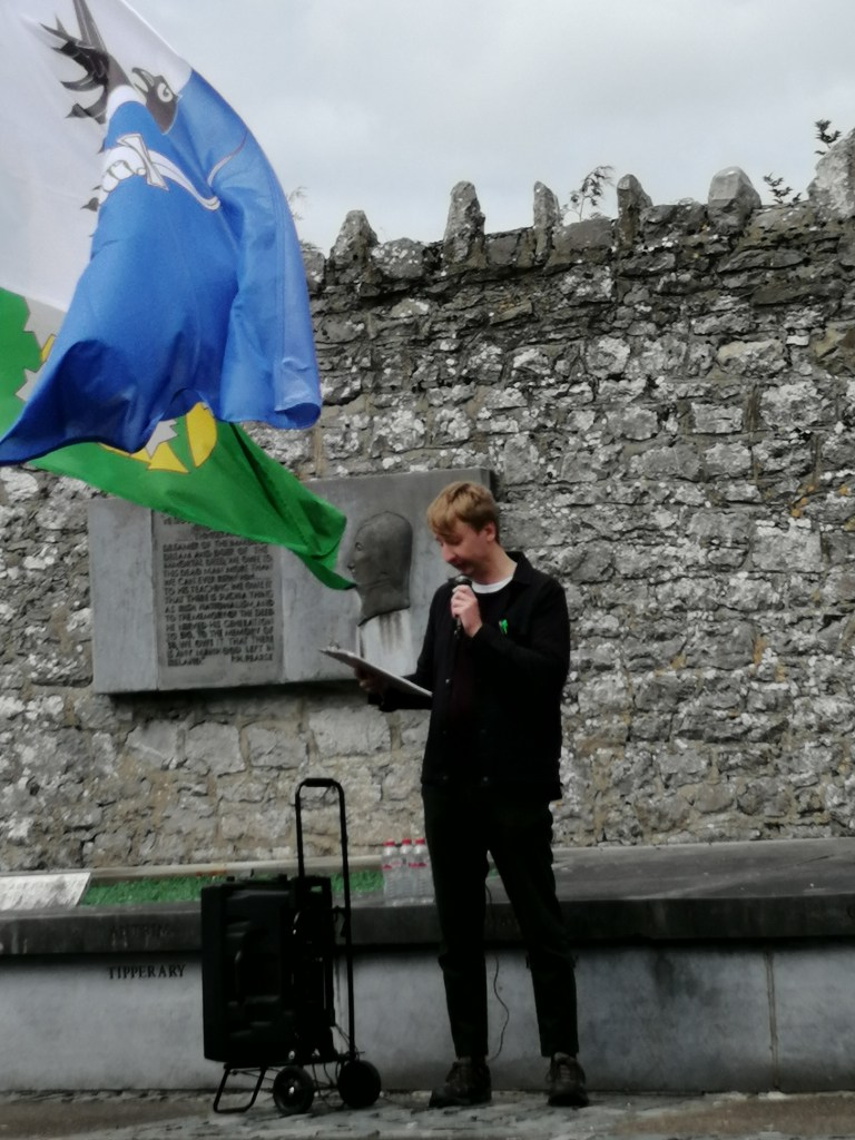 The rally was preceded by a small march led by a colour party to approach the cemetery, where it was joined by others to march into the cemetery. Opening the event, the MC welcomed everyone in Irish before continuing to speak in English, putting the event in its context of history since the late 18th Century onwards up to the present, referencing recent activity of supporters of the ISR, AIAI and the Revolutionary Housing League before going on to introduce the next speaker.
