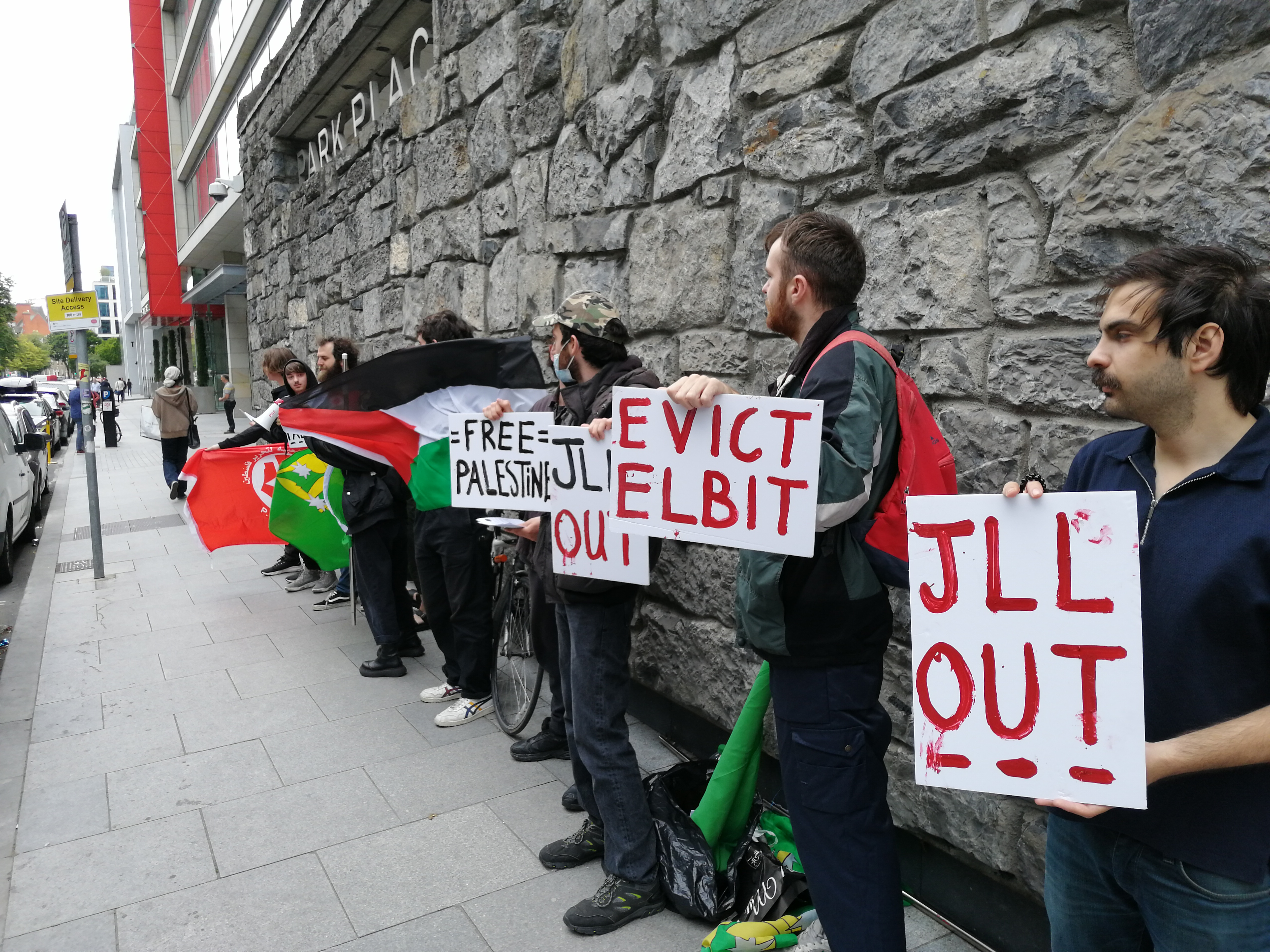 In a leaflet handed out to construction workers, office workers and passers-by, AIA stated that JLL “work with Elbit Systems, the largest private arms supplier for the occupation” and that last year “their CEO boasted about ‘a significant increase in (its) activity in Israel’ “.