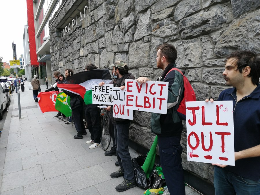 Hatch street in Dublin is an unusual venue to hear the sounds of a political protest but that was where a protest took place Friday, outside the headquarters of Jones Lang LaSalle, an Anglo-US real estate and investment multinational.