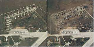 Satellite imagery of and report on strikes against Russian airbase in the Crimea: https://www.theguardian.com/world/2022/aug/11/russian-warplanes-destroyed-in-crimea-saky-airbase-attack-satellite-images-show