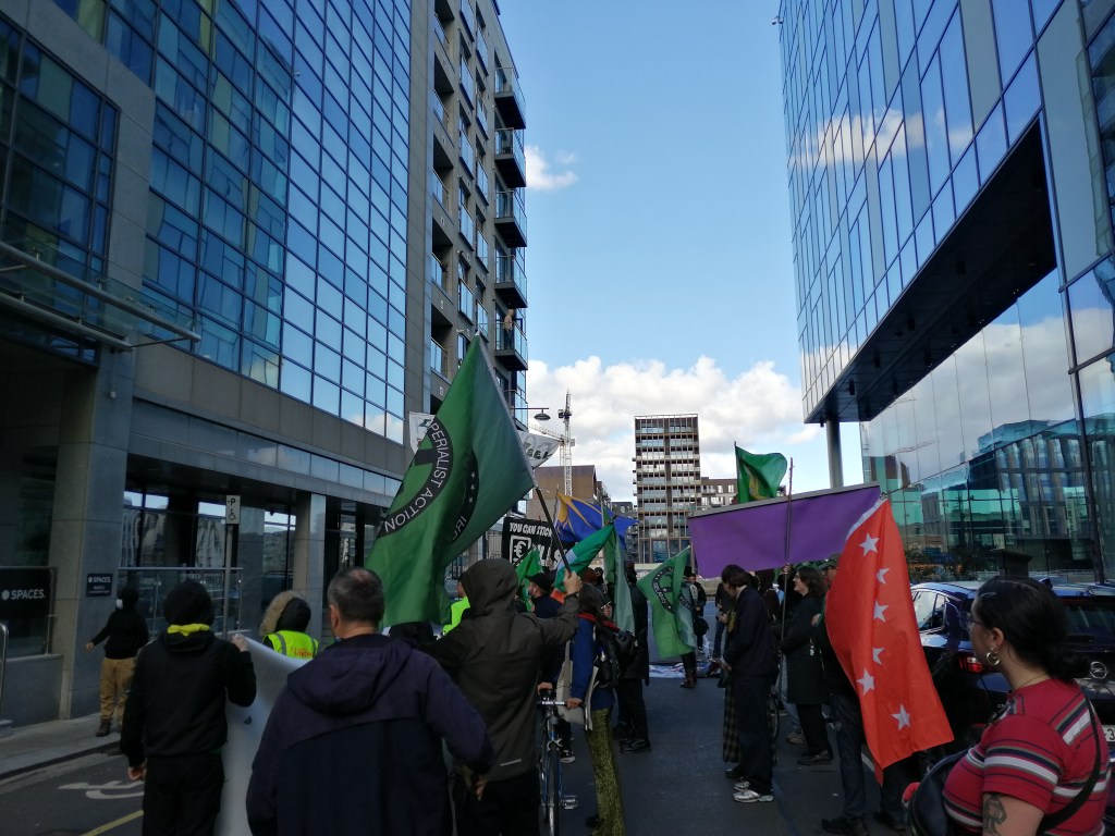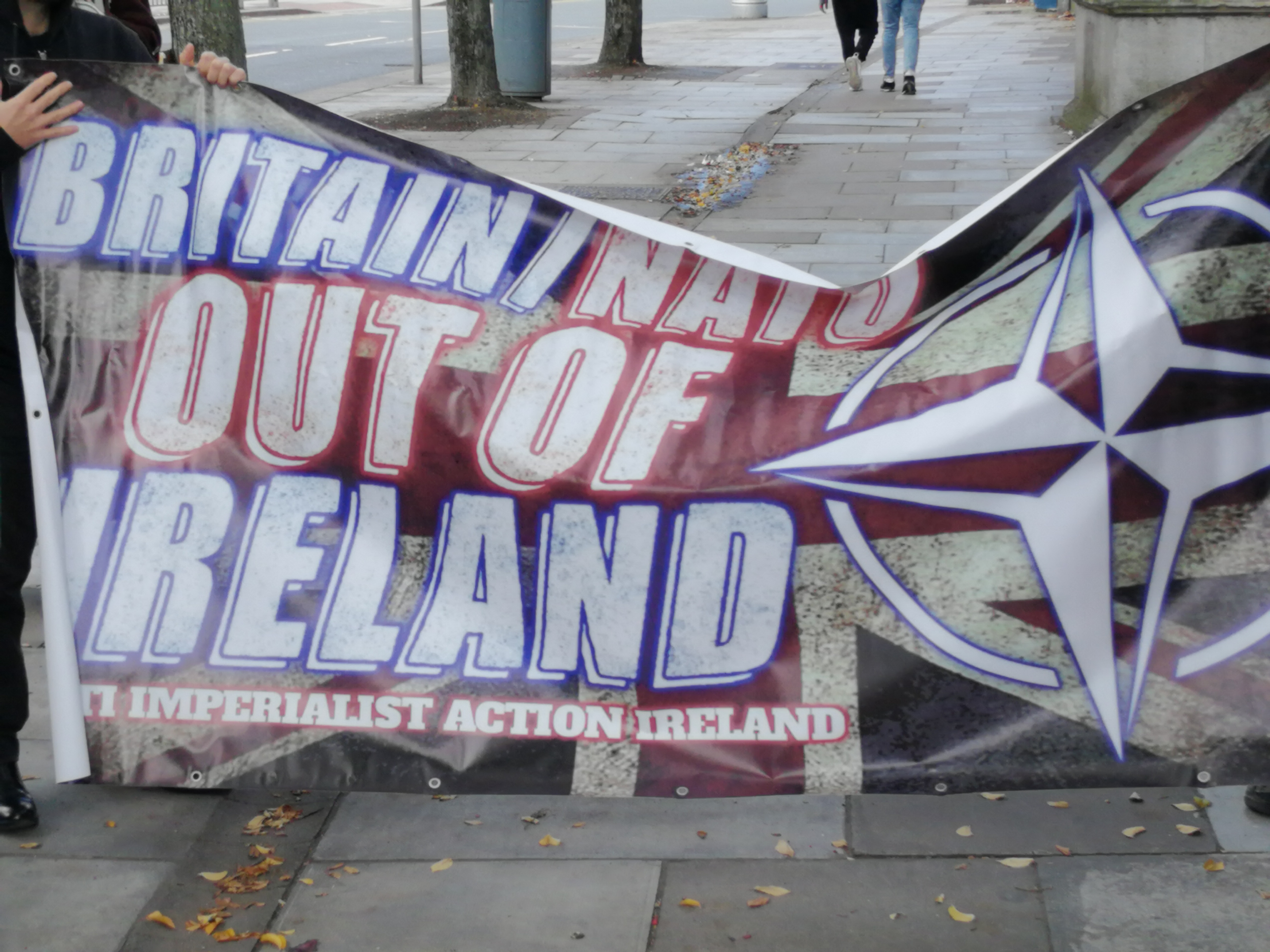 At the Connolly monument, people gathered with banners about the housing struggle and against NATO, along with placards and flags, of which latter the most common was the green-and-gold version of the “Starry Plough”, flag of the Irish Citizen Army4.