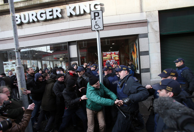 The Gardaí rescued the fascists from the pub and loaded them into one of their vans before driving off. A decoy Garda van was blocked in O’Connel Street by protestors and interested youth for a period but the fascists were spirited away to safety in another van.